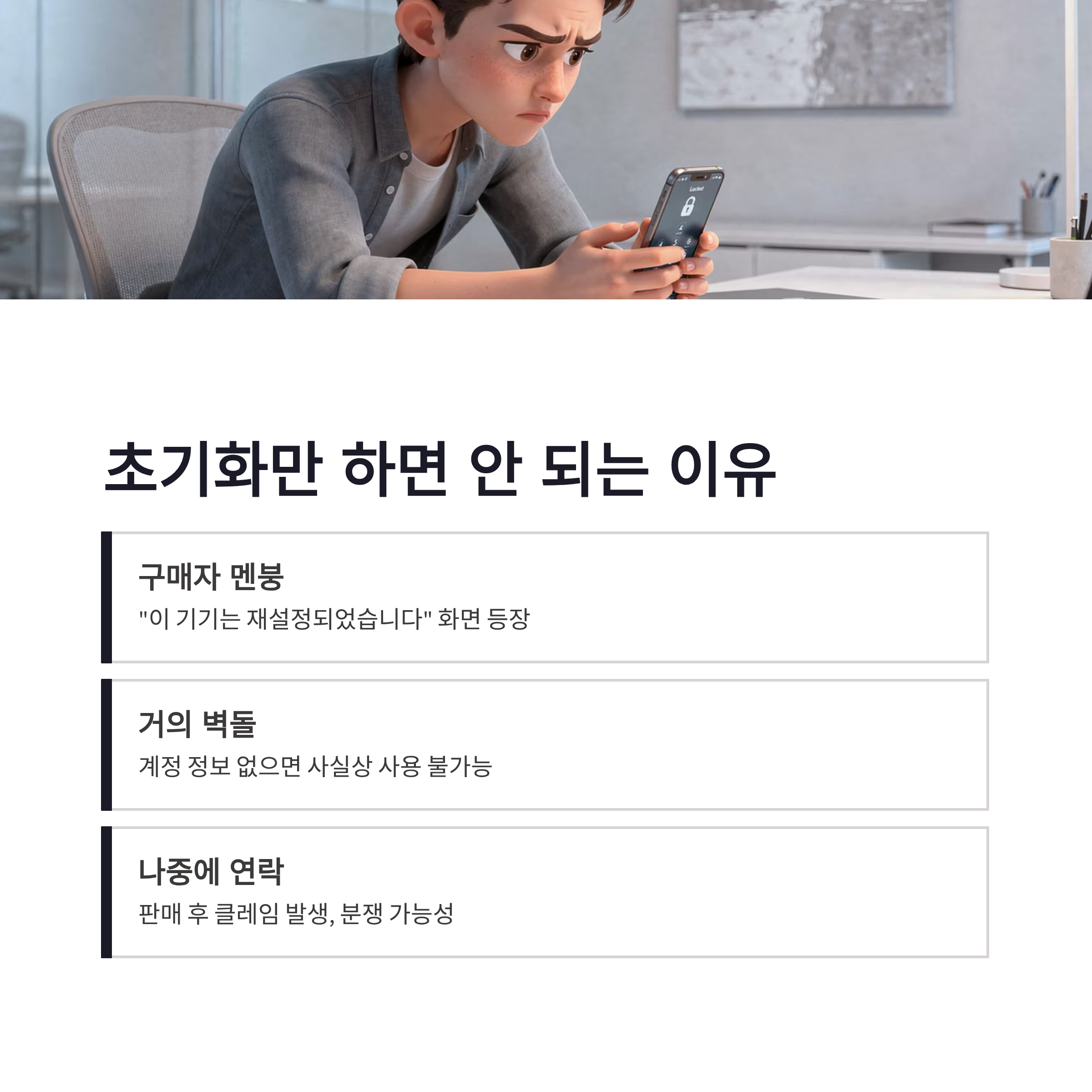 중고로 폰 팔기 전에 그냥 갤럭시 공장초기화만 하면 끝이라고 생각하시는 분들 진짜 많더라구요. 저도 예전엔 그랬구요 ㅠㅠ 근데 아무 준비 없이 갤럭시 공장초기화부터 눌러버리면, 구매자가 전원 켜자마자 멘붕 오는 화면이 뜹니다. 바로 구글락(FRP)이에요.