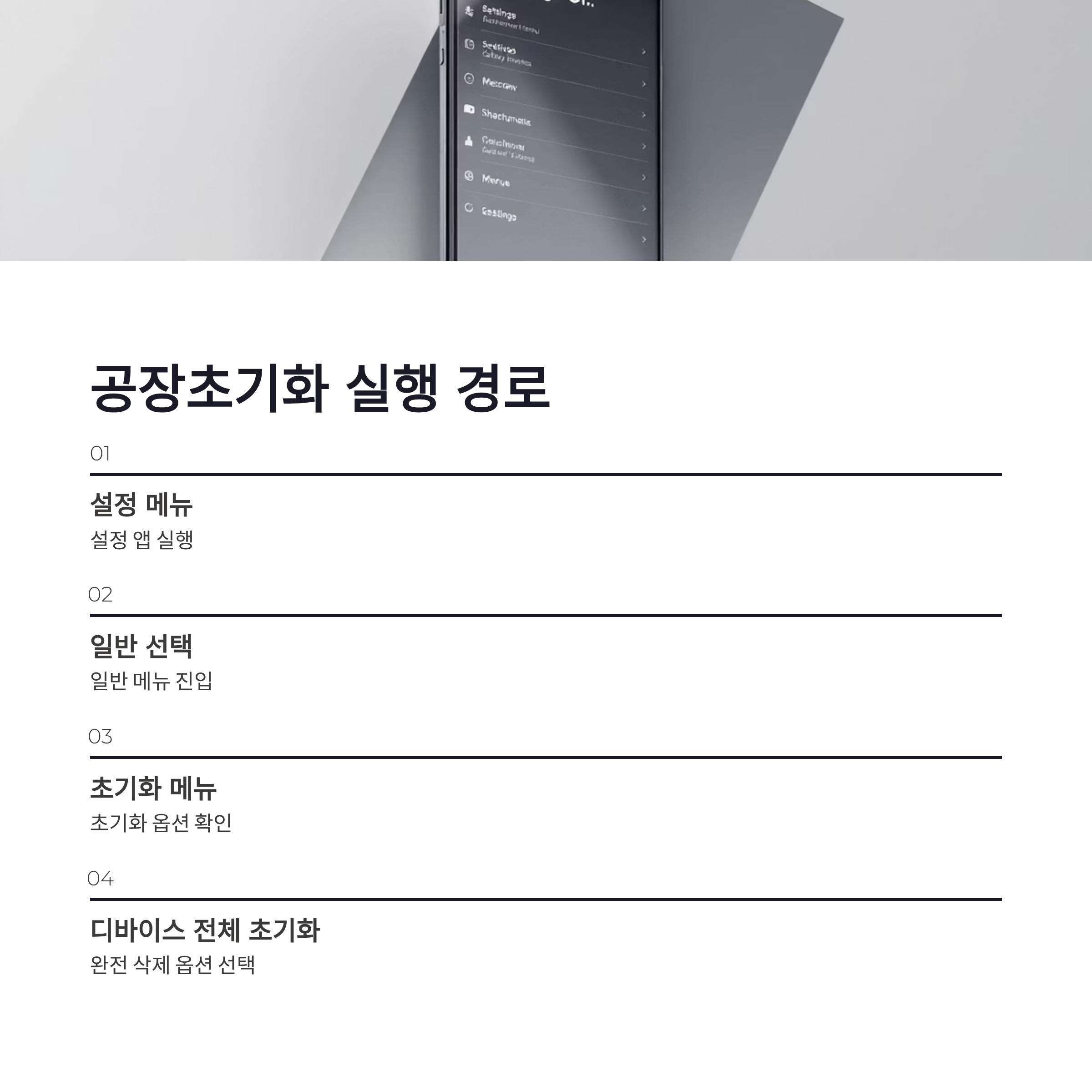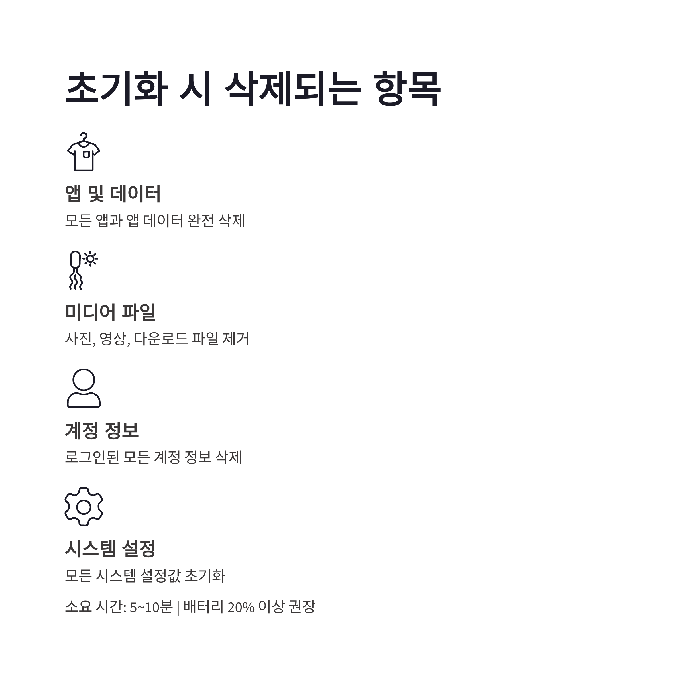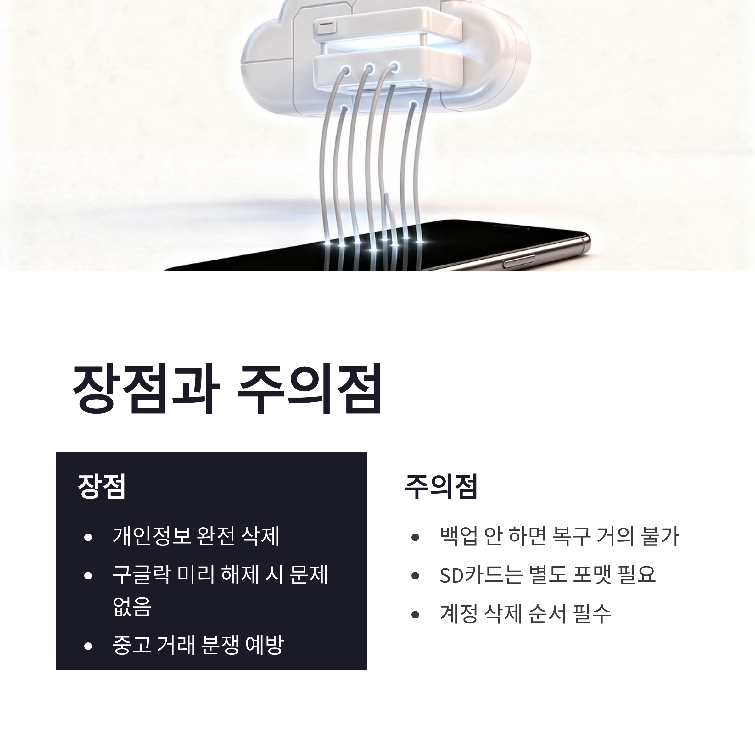 * 백업 안 하면 복구 거의 불가 * SD카드는 별도 포맷 필요 * 계정 삭제 순서 안 지키면 낭패