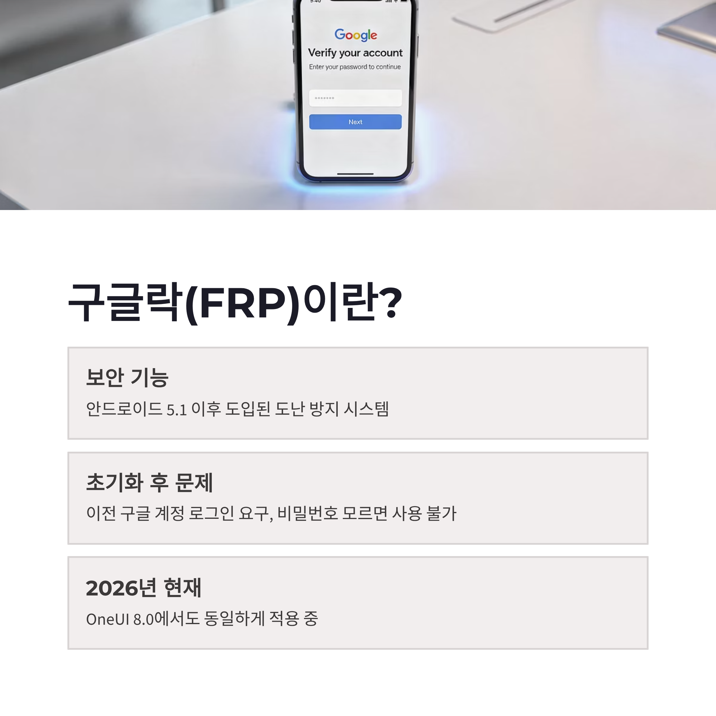 안드로이드 5.1 이후 도입된 FRP(Factory Reset Protection)는 도난 방지용 보안 기능입니다. 2026년 기준 최신 OneUI 8.0에서도 동일하게 적용되고 있구요. 구글 계정이 로그인된 상태에서 갤럭시 공장초기화를 하면, 재부팅 후 “이 기기는 재설정되었습니다”라는 문구와 함께 이전 구글 계정 로그인 요구가 뜹니다.