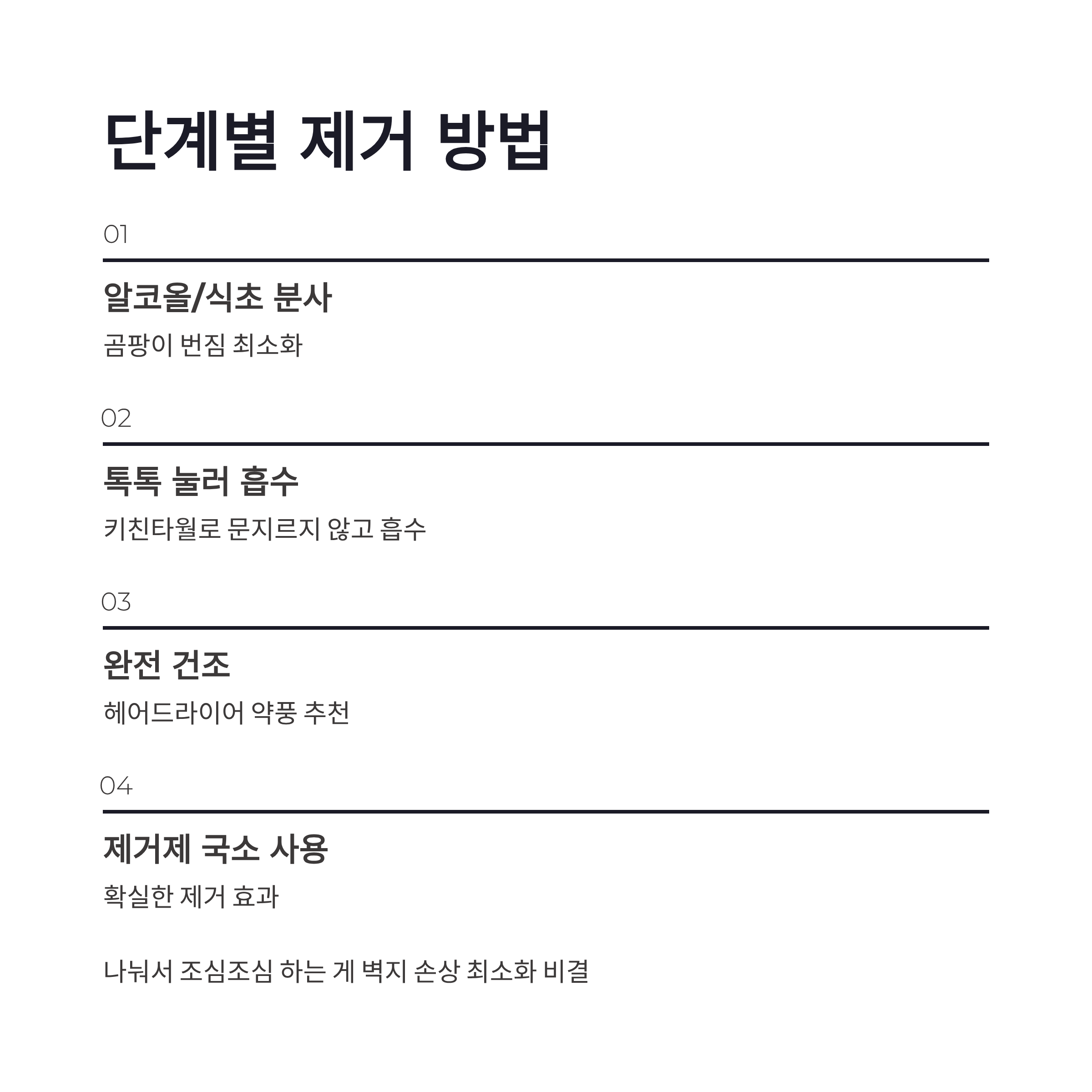 | 단계 | 방법 | 체감 포인트 | | -- | ---------------- | ------------------- | | 1 | 알코올 또는 식초 희석액 분사 | 곰팡이 번짐 최소화 | | 2 | 키친타월로 톡톡 눌러 흡수 | 문지르지 않는 게 핵심 | | 3 | 완전 건조 | 헤어드라이어 약풍 추천 | | 4 | 곰팡이 제거제 국소 사용 | 벽지 곰팡이 제거 효과 확실 |