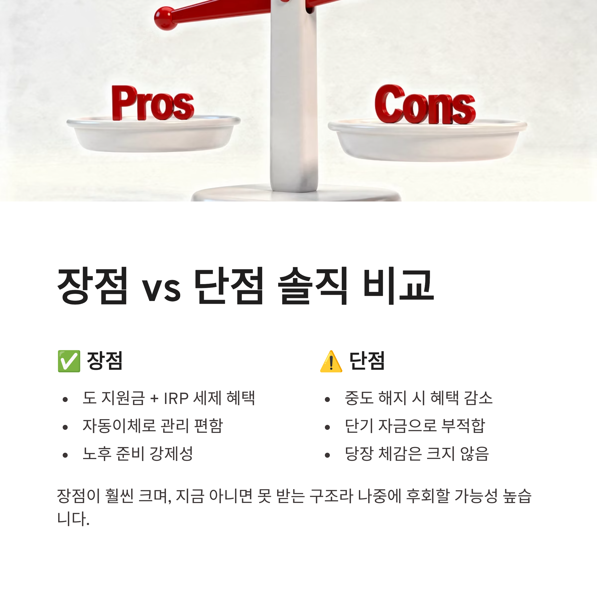 * 도 지원금 + IRP 세제 혜택 동시에 가능 * 자동이체로 관리 편함 * 노후 준비 강제성 생김(이게 은근 큼)