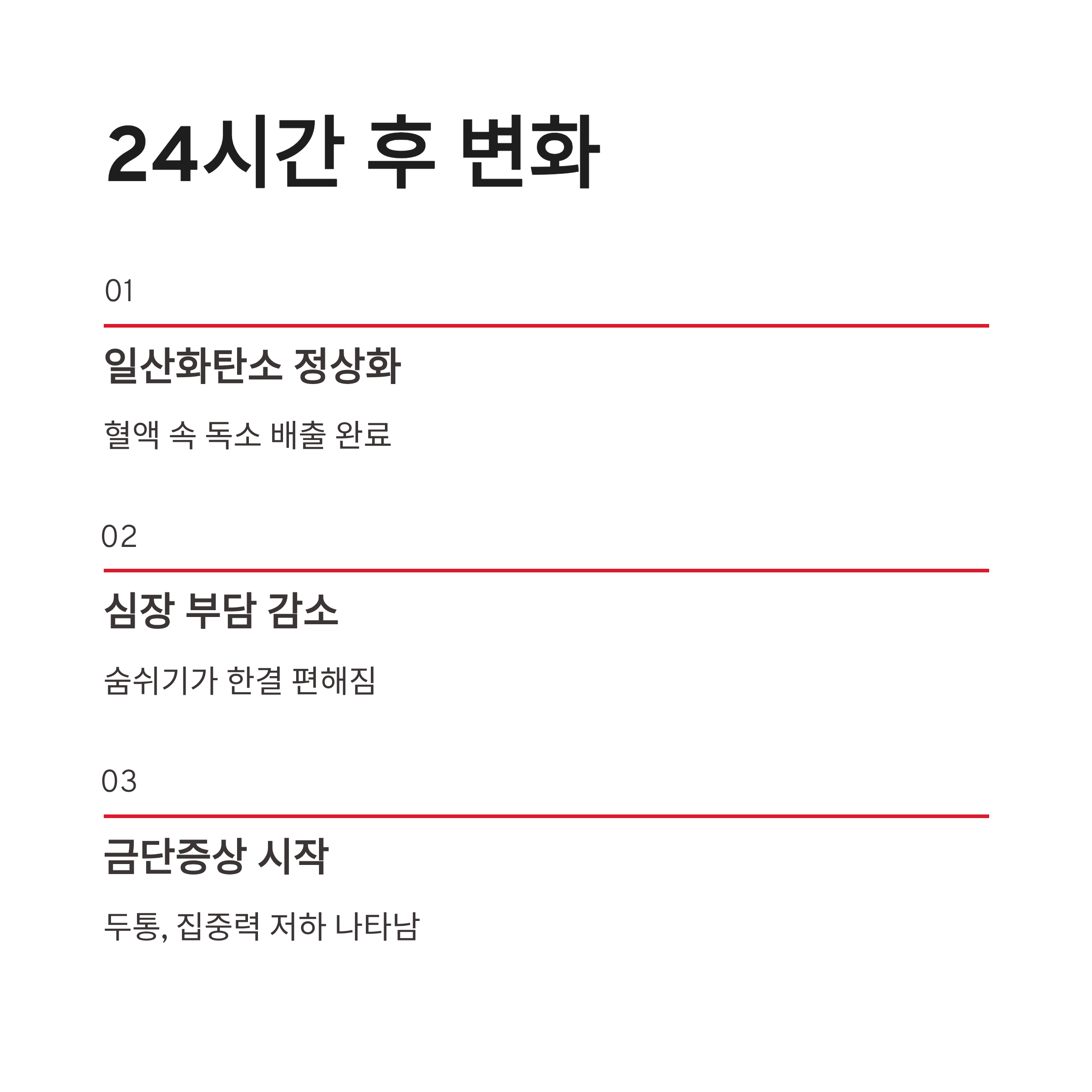 솔직히 금연을 결심하는 순간 제일 무서운 게 “과연 몸이 버텨줄까?” 이거잖아요. 저도 그랬구요. 근데 신기하게도 금연 후 신체 변화는 생각보다 엄청 빠르게 시작되더라구요. 금연 20분 후만 지나도 혈압과 맥박이 안정 쪽으로 내려가고, 손발이 차가웠던 분들은 체온이 슬슬 돌아옵니다. 이게 뭐 대단한 변화인가 싶지만, 몸 입장에선 니코틴 공급이 끊기면서 자율신경계가 정상 리듬을 찾기 시작한 거라 꽤 큰 신호예요. 저는 이 시점에 괜히 숨을 크게 쉬어봤는데요, “아 공기 맛이 다르네?” 이런 느낌도 들더라구요 ㅎㅎ 기분 탓일 수도 있지만, 혈액 산소량이 올라가는 단계라 실제로 맞는 말이기도 합니다.
