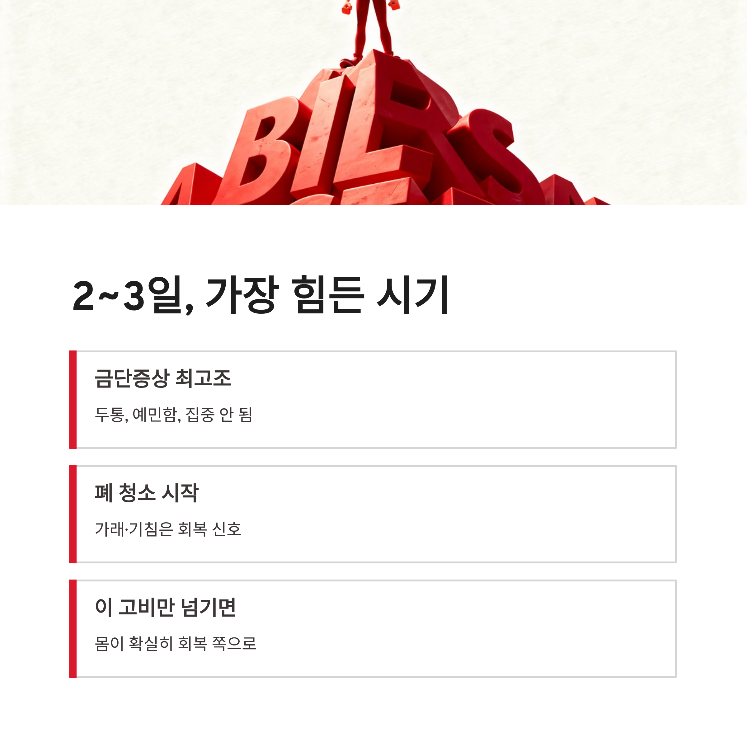 | 3일 | 니코틴 배출 완료 | 금단 최고조 |