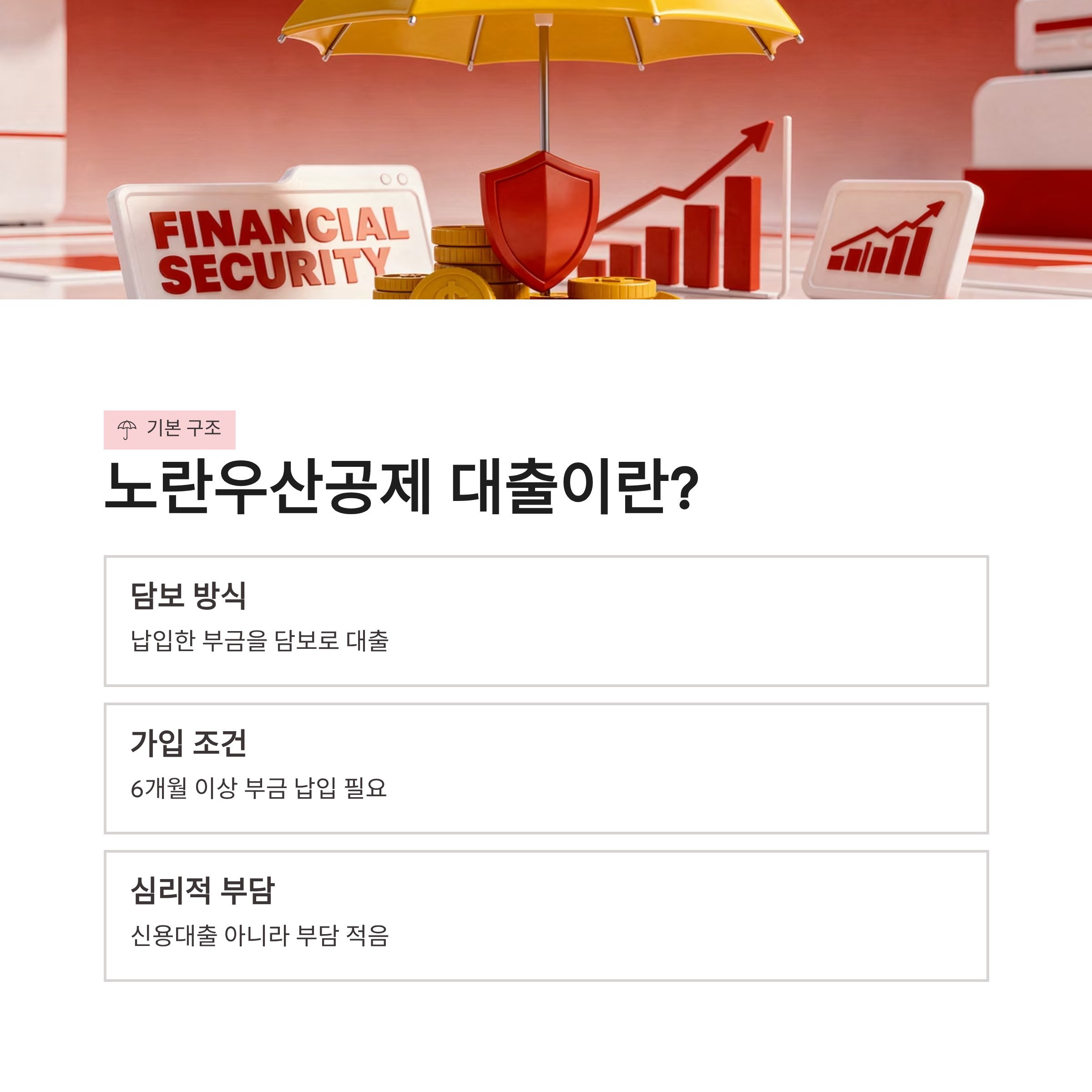 사업하다 보면 진짜 예상 못 한 타이밍에 돈이 급해질 때가 옵니다. 저도 매출은 있는데 입금 타이밍이 엇갈리면서 숨이 턱 막힌 적이 있었구요. 그때 알아본 게 노란우산공제 대출이었어요. 이름만 들으면 뭔가 복잡할 것 같았는데, 막상 보니까 구조는 단순하더라구요. 노란우산공제 대출은 공제에 가입한 소상공인·자영업자가 납입한 부금을 담보로 받는 방식입니다. 가입만 했다고 바로 되는 건 아니고, 보통 6개월 이상 부금 납입이 기준이 되더라구요. 연체 이력 없고 정상 납부 중이면 대부분 검토 대상이 됩니다. 신용대출이 아니라서 심리적 부담도 덜했구요. 솔직히 이 부분에서 마음이 좀 놓였어요 ㅎㅎ