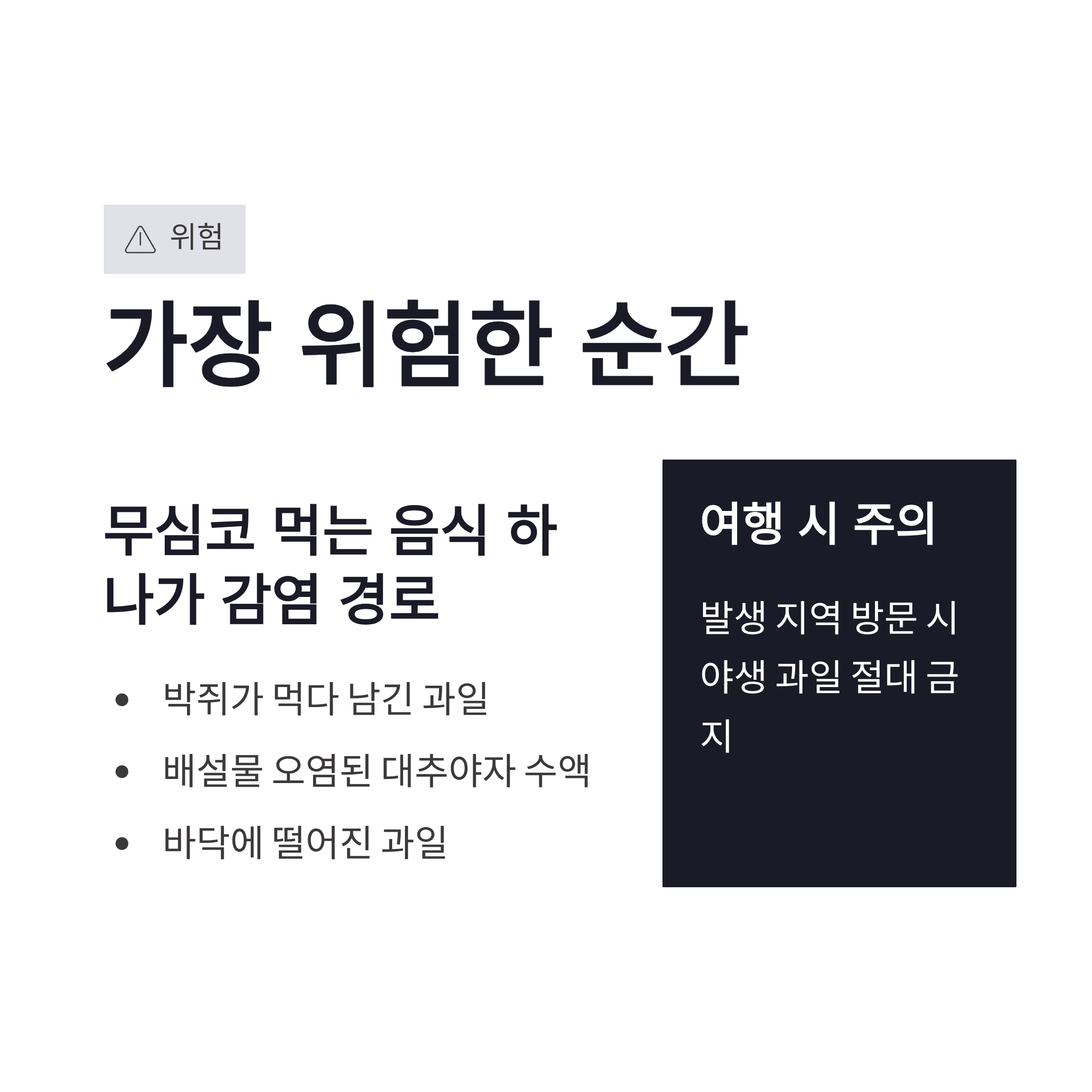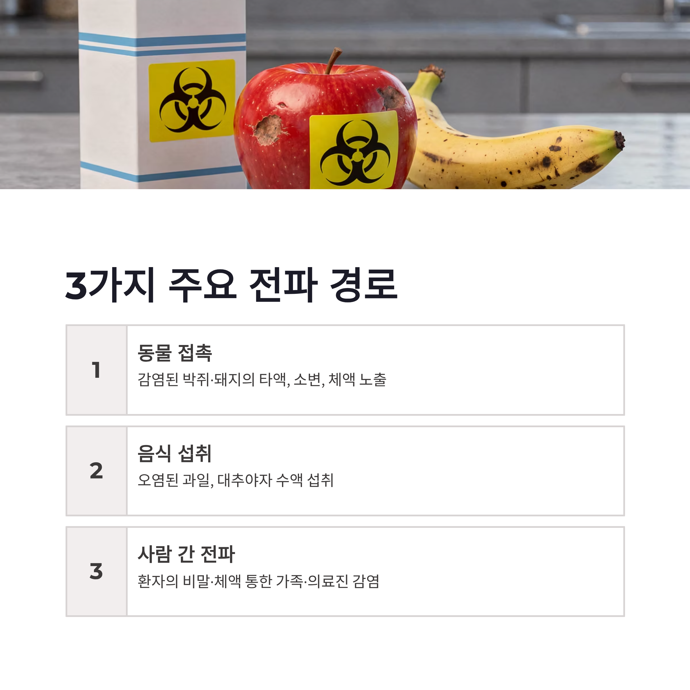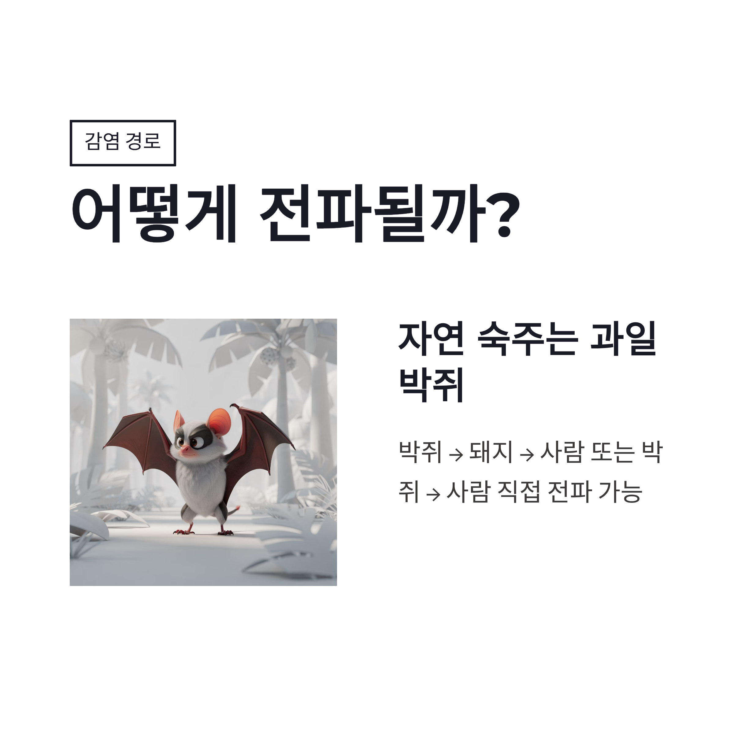 | 동물 접촉 | 감염된 박쥐·돼지의 타액, 소변, 체액 노출 |