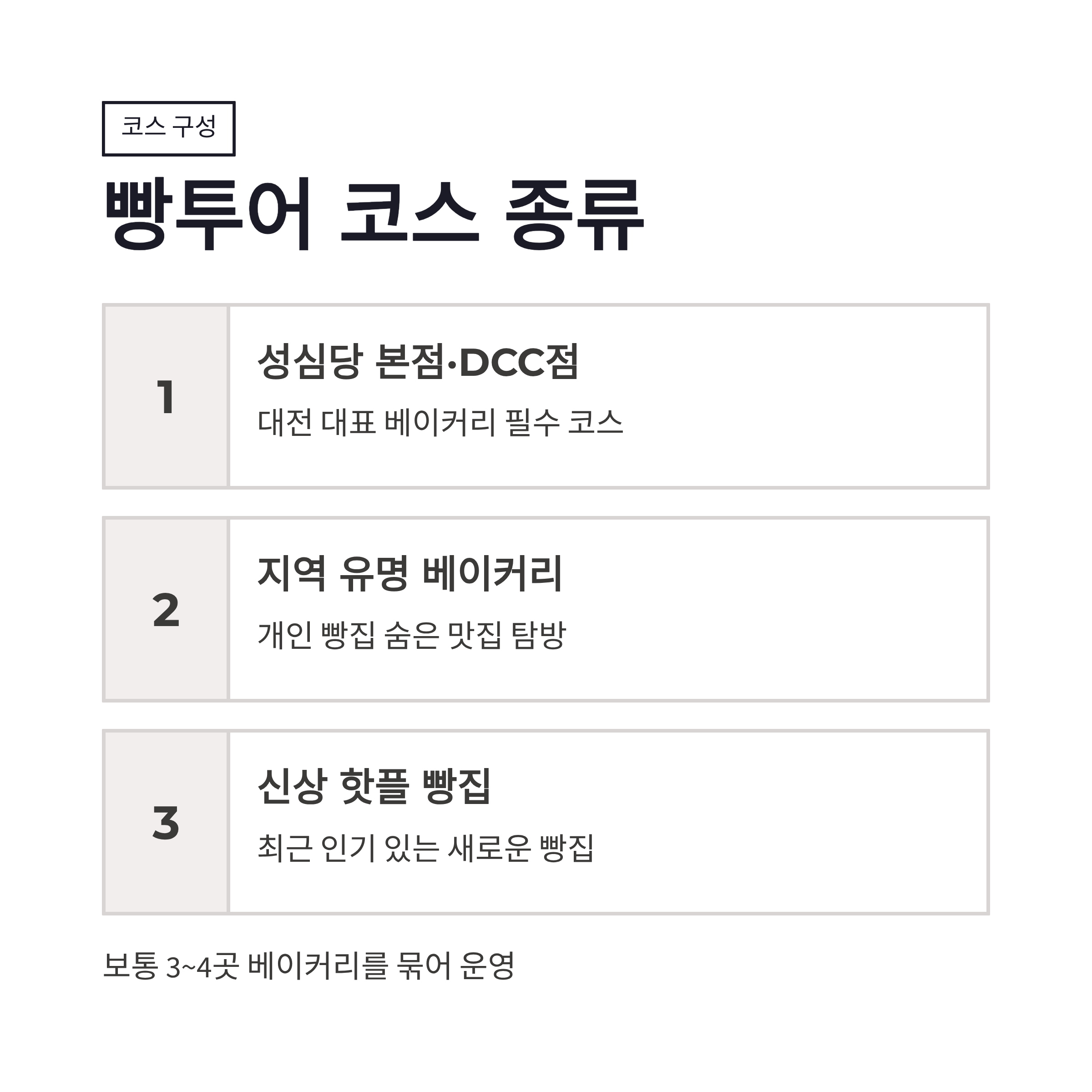 대전 빵택시의 코스는 보통 3~4곳 베이커리를 묶어서 운영됩니다. 성심당 본점 또는 DCC점, 지역 유명 개인 베이커리, 최근 핫한 신상 빵집까지 섞는 구조였구요. 가격은 시간 기준으로 책정되는 경우가 많았습니다.