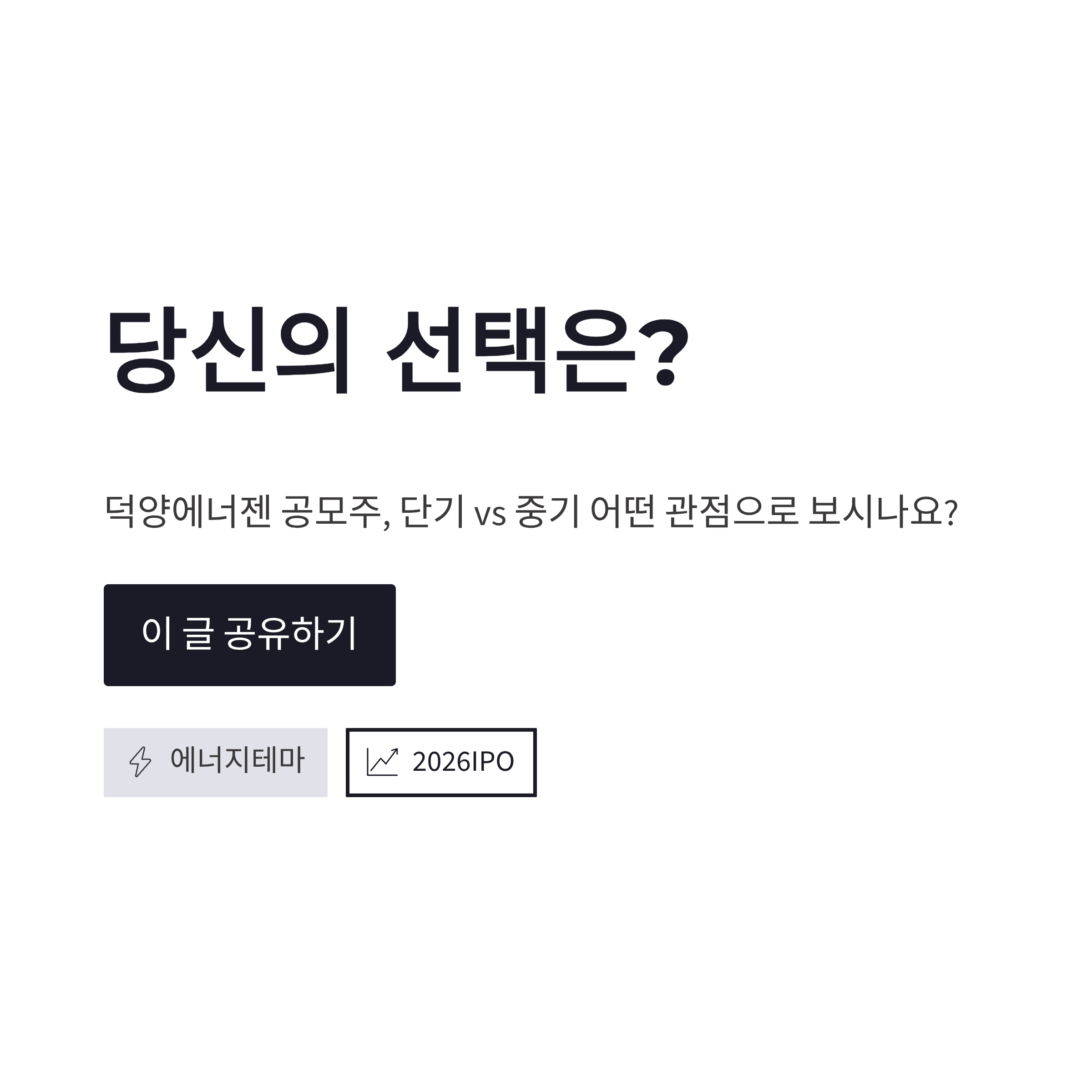 정리해보면 덕양에너젠 공모주는 “무조건 단기 차익”을 노리는 분보다는, 2026년 시장 흐름 안에서 에너지 테마를 천천히 가져가고 싶은 분들께 더 어울리는 느낌이었어요. 저도 개인적으로는 기대 반, 경계 반으로 접근하는 게 맞다고 봤구요. 공모주도 결국 *주식*이라서요. 여러분은 덕양에너젠 공모주, 단기냐 중기냐 어떤 관점으로 보고 계신가요?