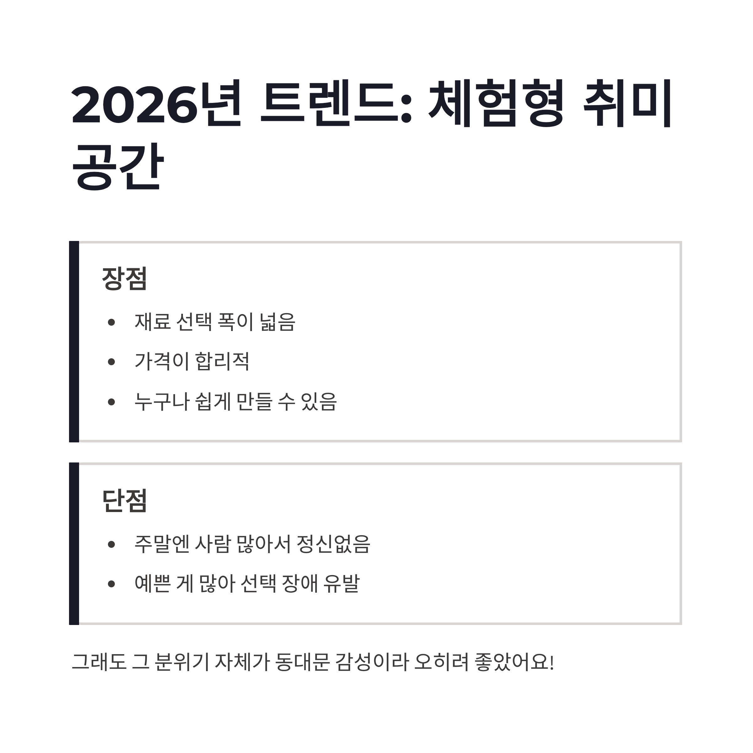 2026년 기준으로 보면 동대문 파라파라는 단순 쇼핑보다 체험형 취미 공간 느낌이 강해졌어요. 요즘 Z세대 사이에서 커스텀 아이템이 유행이다 보니, 커플·친구끼리 같이 오는 분들도 많더라구요. 장점은 재료 선택 폭이 넓고 가격이 합리적이라는 점! 단점은… 주말엔 사람 많아서 살짝 정신없다는 거? ㅎㅎ 그래도 그 분위기 자체가 동대문 감성이라 저는 오히려 좋았어요.