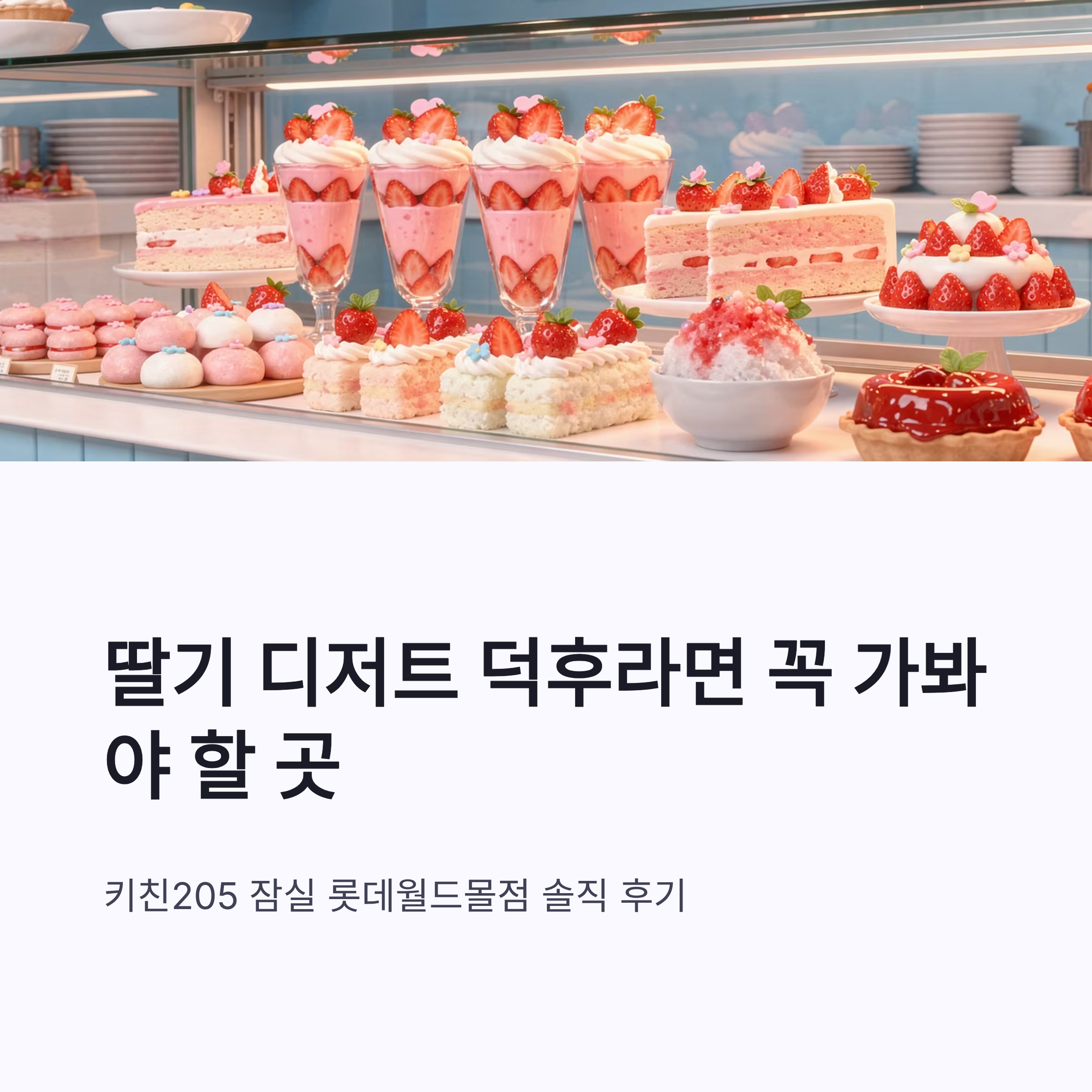 정리해보면 키친205 잠실 롯데월드몰점은 딸기 좋아하는 분들이라면 한 번쯤 꼭 가봐야 하는 곳이었어요. 웨이팅은 있지만, 먹고 나면 “아 기다릴 만했네” 소리 나옵니다 ㅎㅎ 딸기 퀄리티, 양, 맛 밸런스까지 전체적으로 만족감 높은 편이었구요. 잠실 데이트 코스나 선물용 디저트로도 꽤 괜찮았어요. 다음엔 홀케이크도 한 번 도전해볼까 고민 중인데… 여러분은 어떤 메뉴가 제일 궁금하신가요?