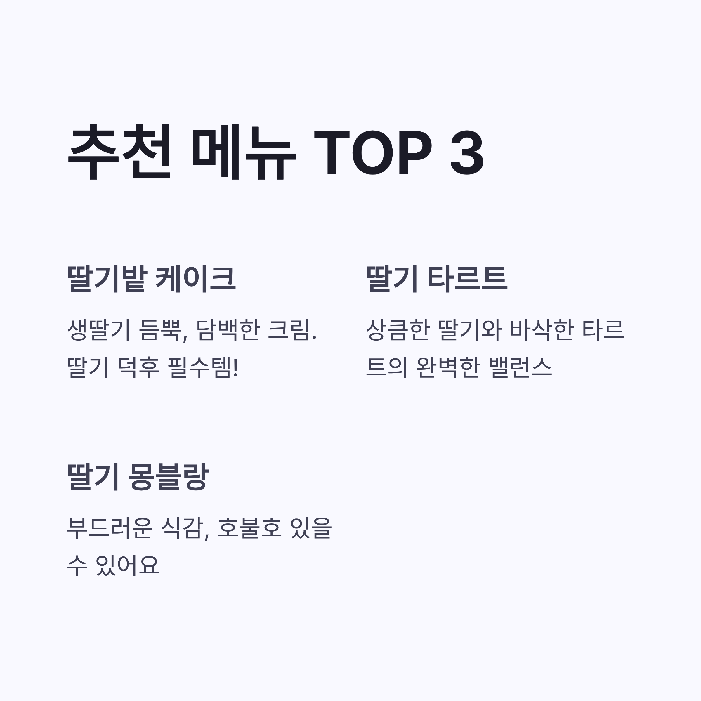 | 딸기밭 케이크 | 생딸기 듬뿍, 크림 담백 | 딸기 덕후 필수 |