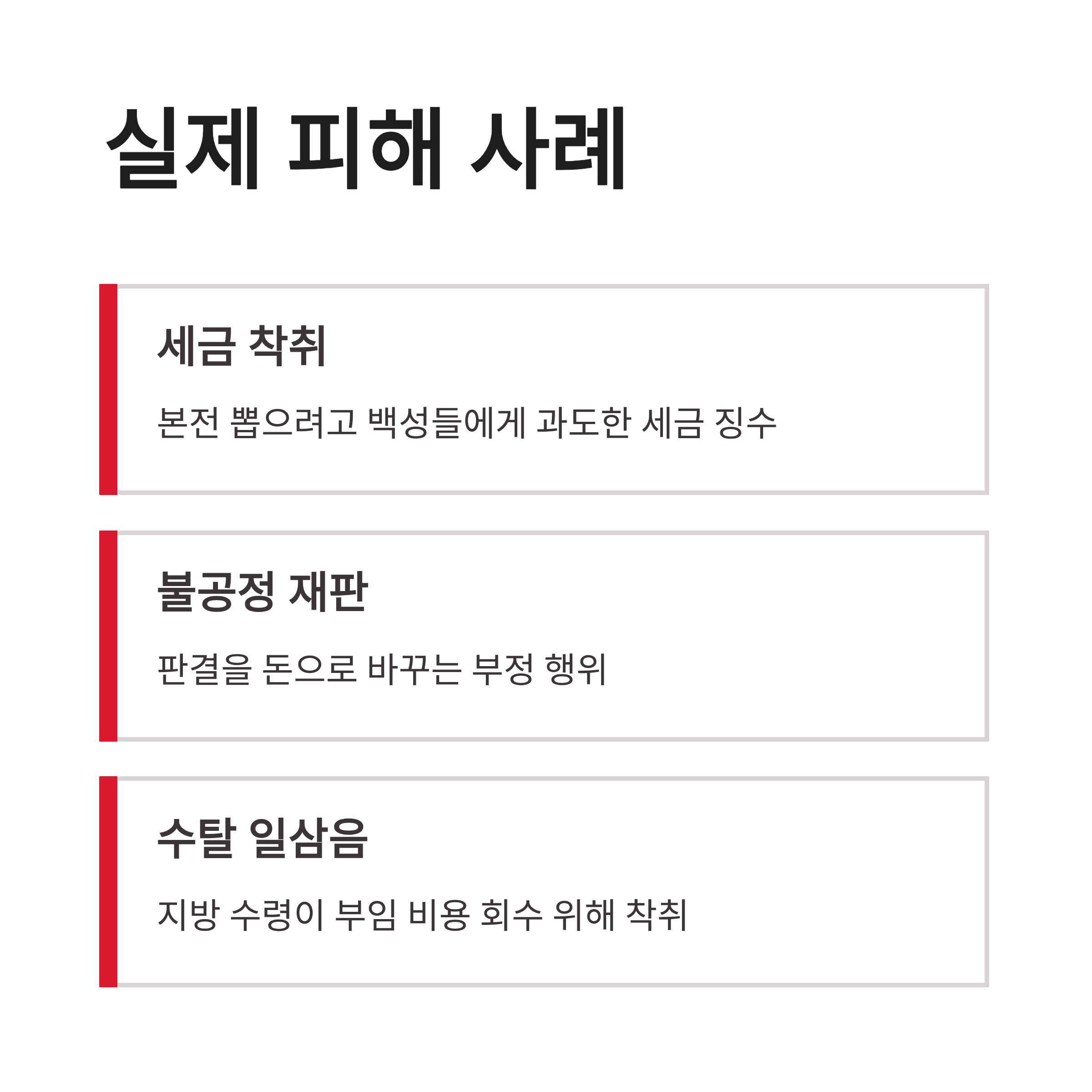 매관매직은 단순한 부패가 아니었어요. 직접적인 피해가 엄청났죠. 관직을 산 관리들은 본전 뽑으려고 백성들한테 세금을 더 걷거나, 판결을 돈으로 바꿔버리는 일도 많았다고 해요. 실제로 조선 후기 실록을 보면 “지방 수령이 부임 비용을 회수하기 위해 수탈을 일삼았다”는 기록이 반복적으로 등장합니다.