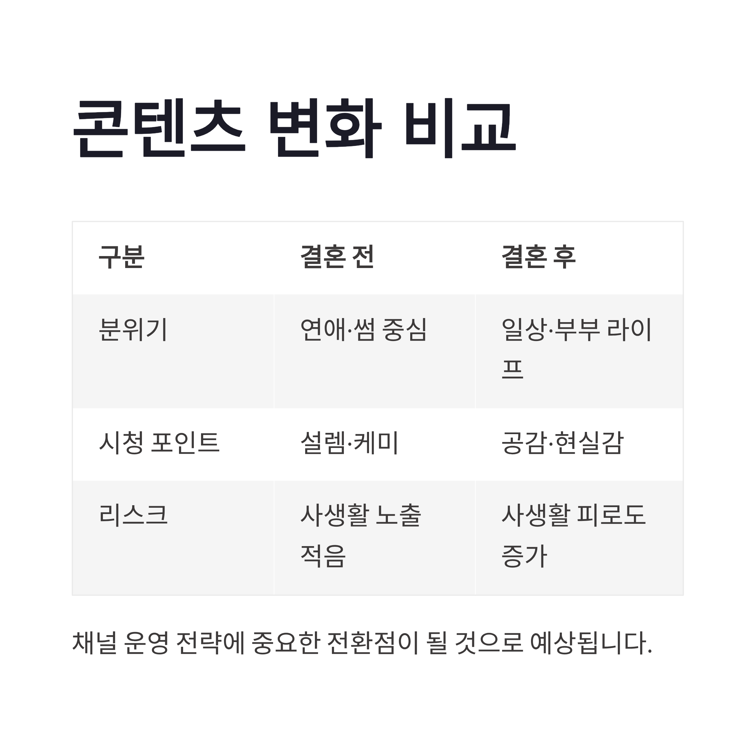 | 구분 | 결혼 전 콘텐츠 | 결혼 후 콘텐츠 |