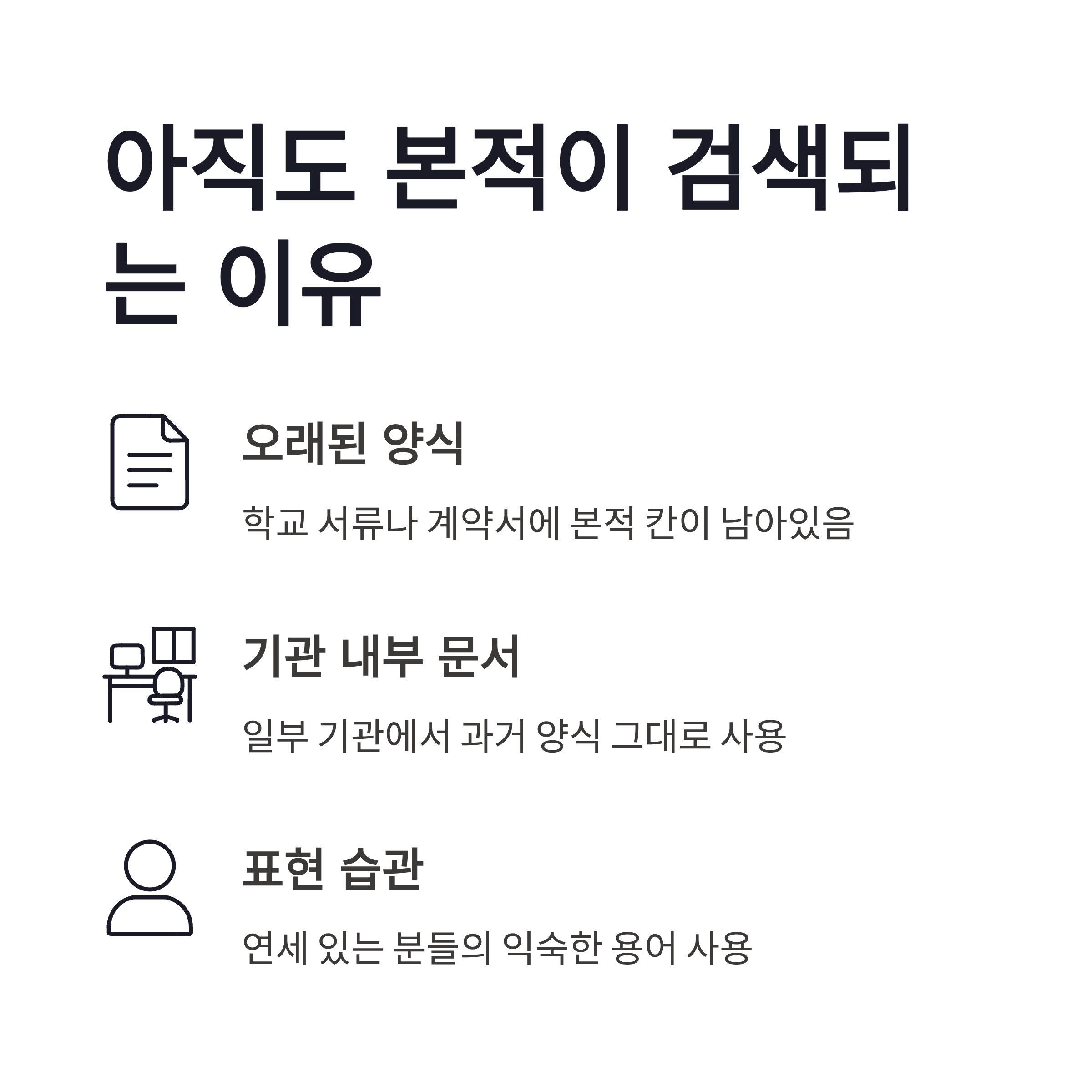 그럼 본적 제도 폐지는 언제였을까요? 공식적으로는 2008년 1월 1일, 가족관계등록법 시행과 함께 본적 개념이 완전히 사라졌습니다. 그러니까 2026년 기준으로 보면… 벌써 꽤 오래전 일이죠. 그런데도 본적 뜻이 계속 검색되는 이유는 뻔합니다. 오래된 양식, 기관 내부 문서, 연세 있는 분들 표현 습관 때문이에요. 특히 학교 서류나 옛 계약서 양식엔 아직도 본적 칸이 남아 있는 경우가 있더라구요. 장점이라면 행정 기준이 개인 중심으로 바뀌어서 훨씬 유연해졌다는 점, 단점은 과도기 표현 때문에 헷갈림이 남아 있다는 점 정도겠쥬.
