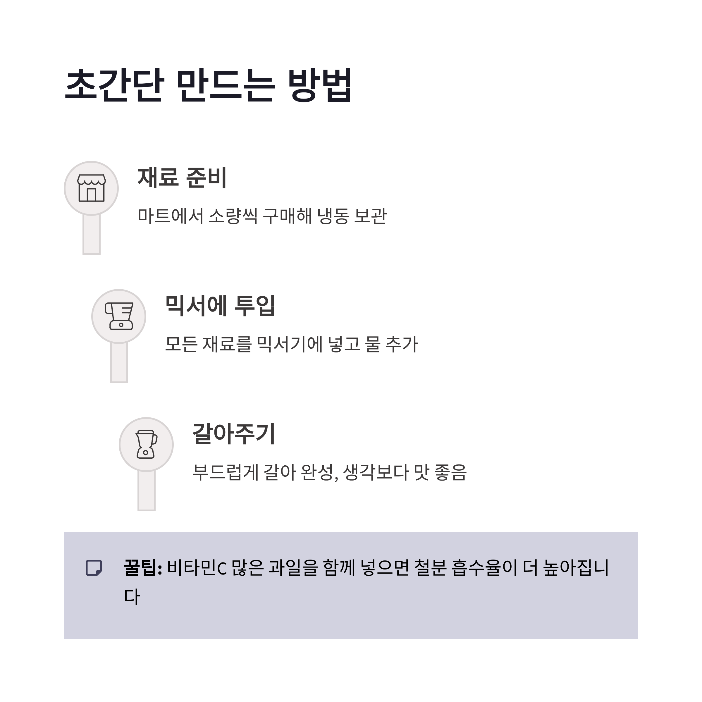 믹서기에 모두 넣고 물 조금 추가해서 갈아주면 끝! 생각보다 맛이 괜찮아서 놀랐구요. 빈혈 과일 보양음료 특유의 흙맛? 그런 거 거의 없었어요. 연관해서 비타민C 많은 과일을 같이 넣으면 철분 흡수에 더 좋다고 하더라구요.