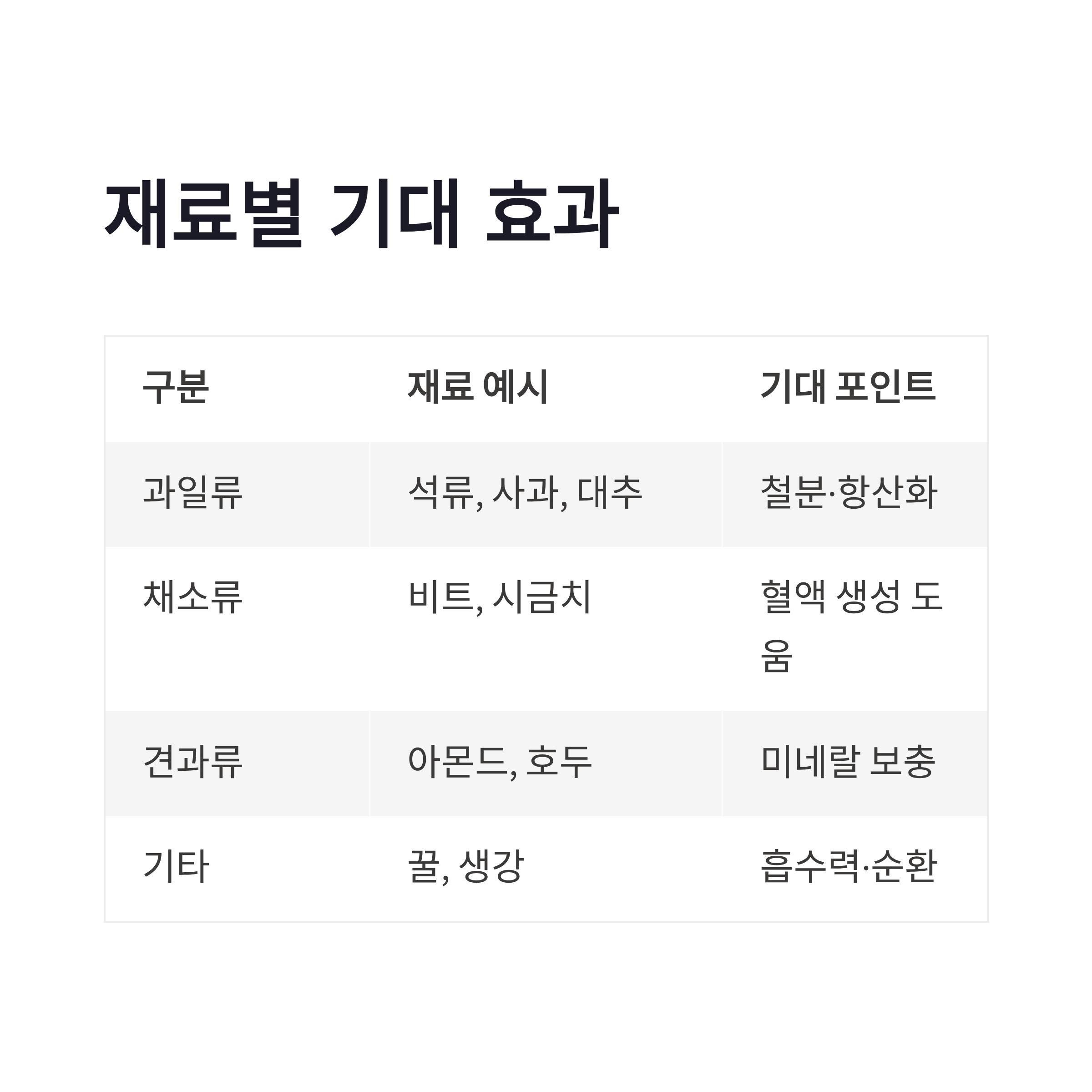 | 과일류 | 석류, 사과, 대추 | 철분·항산화 |