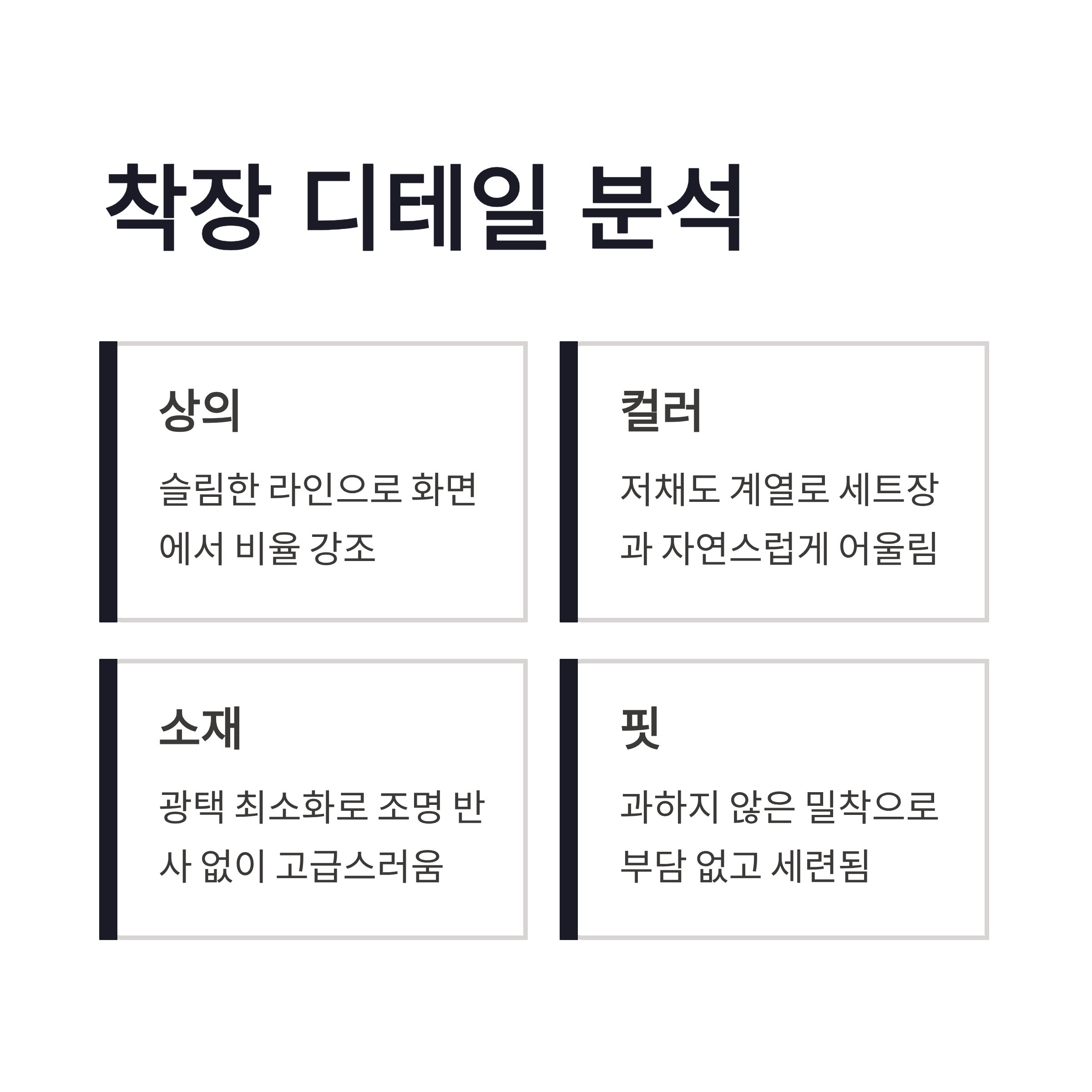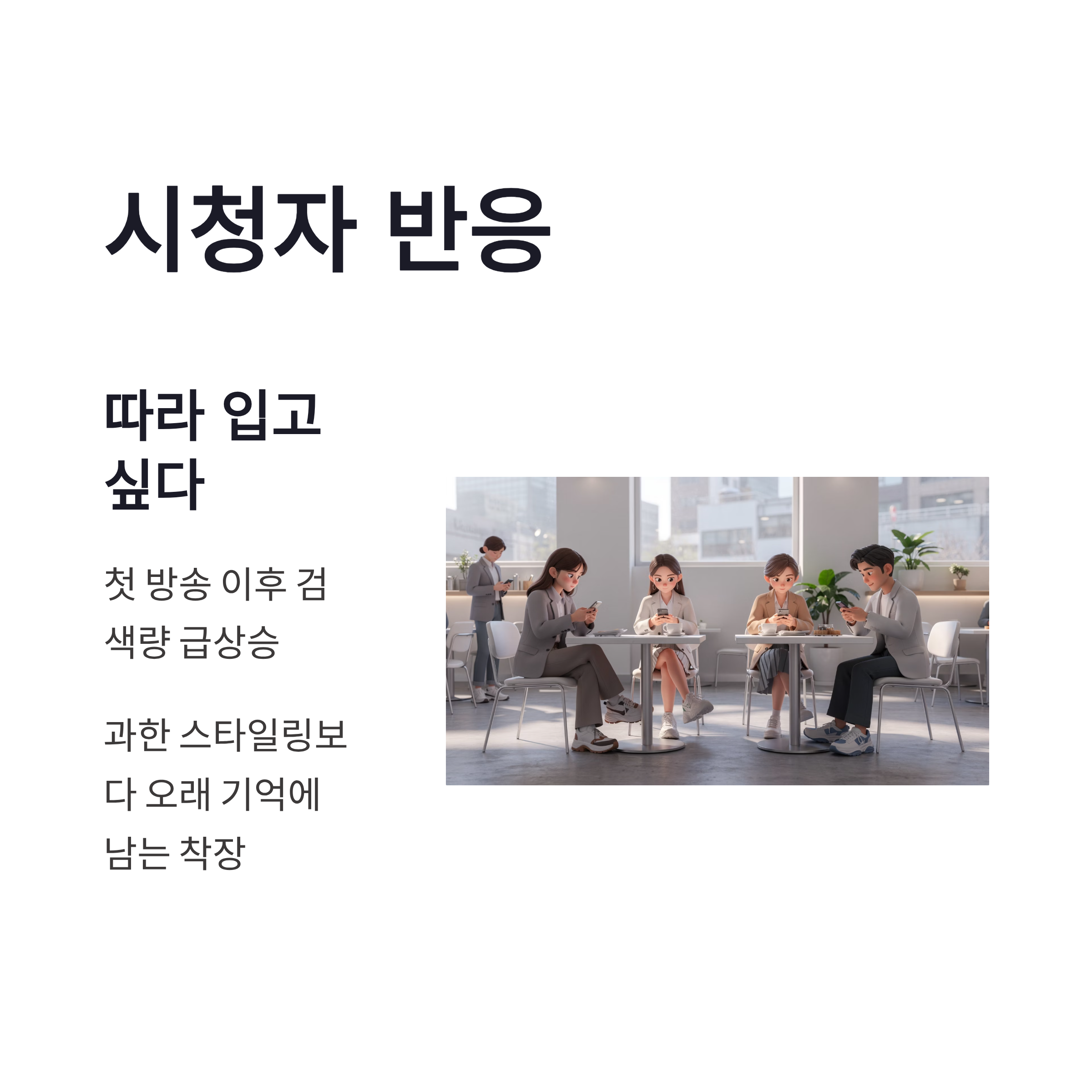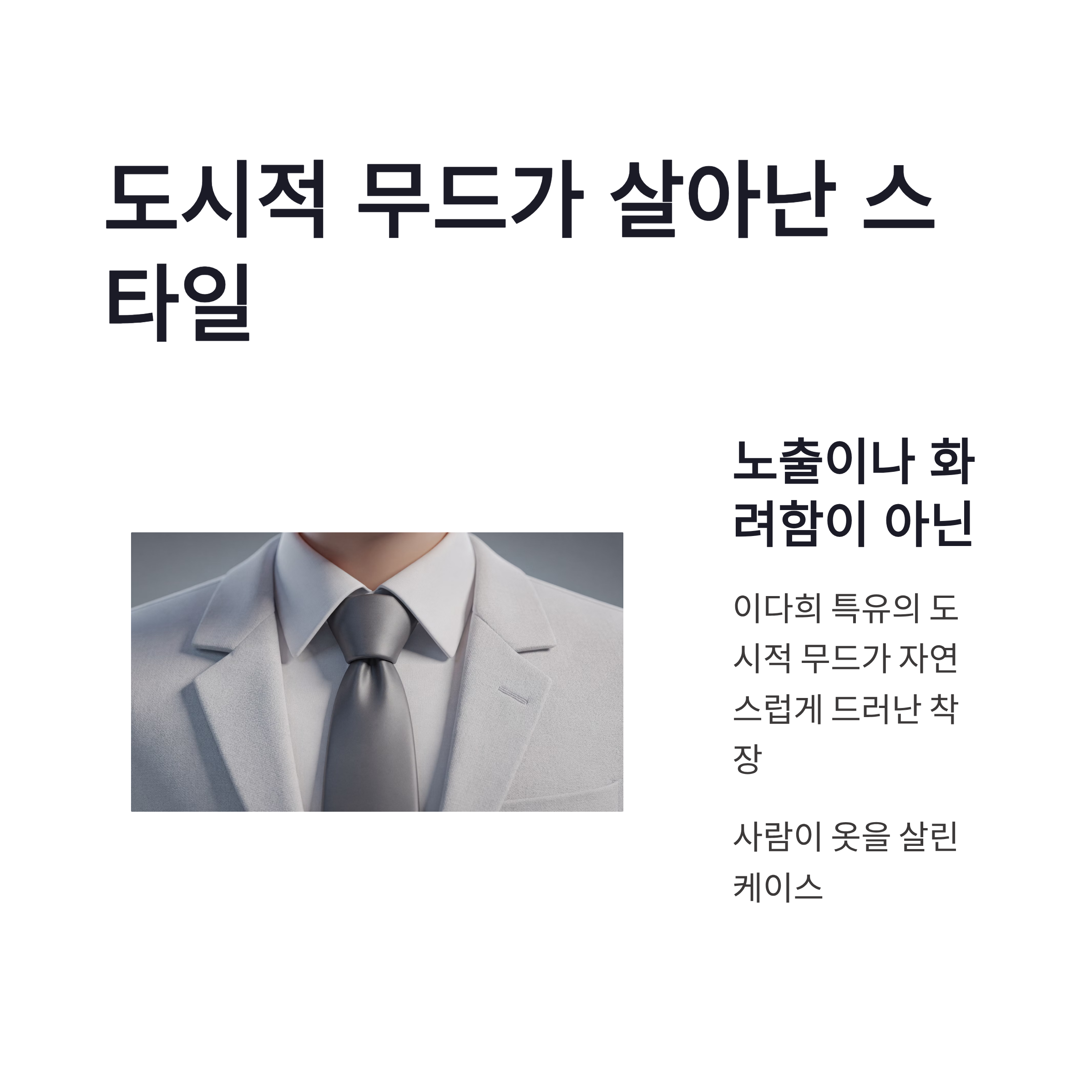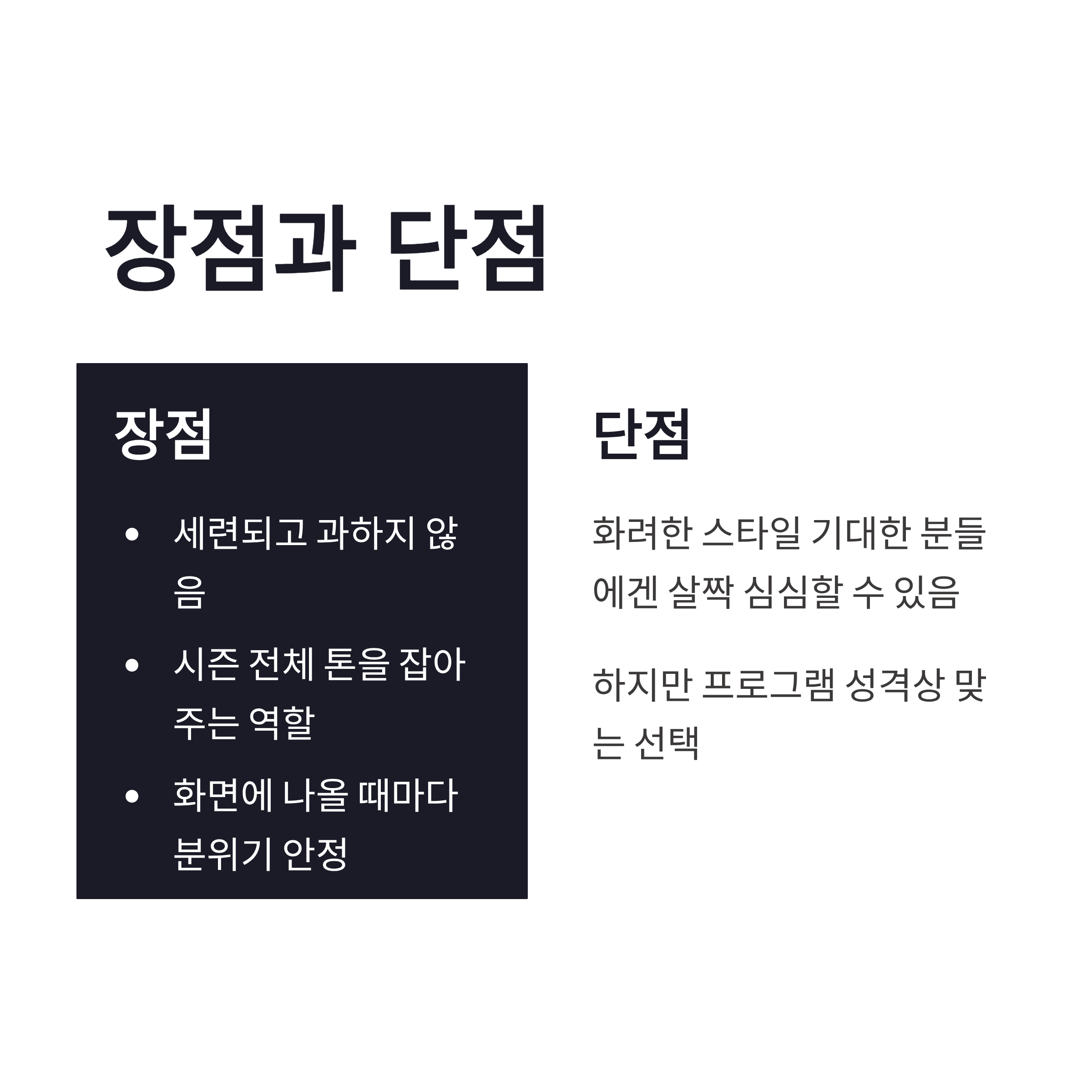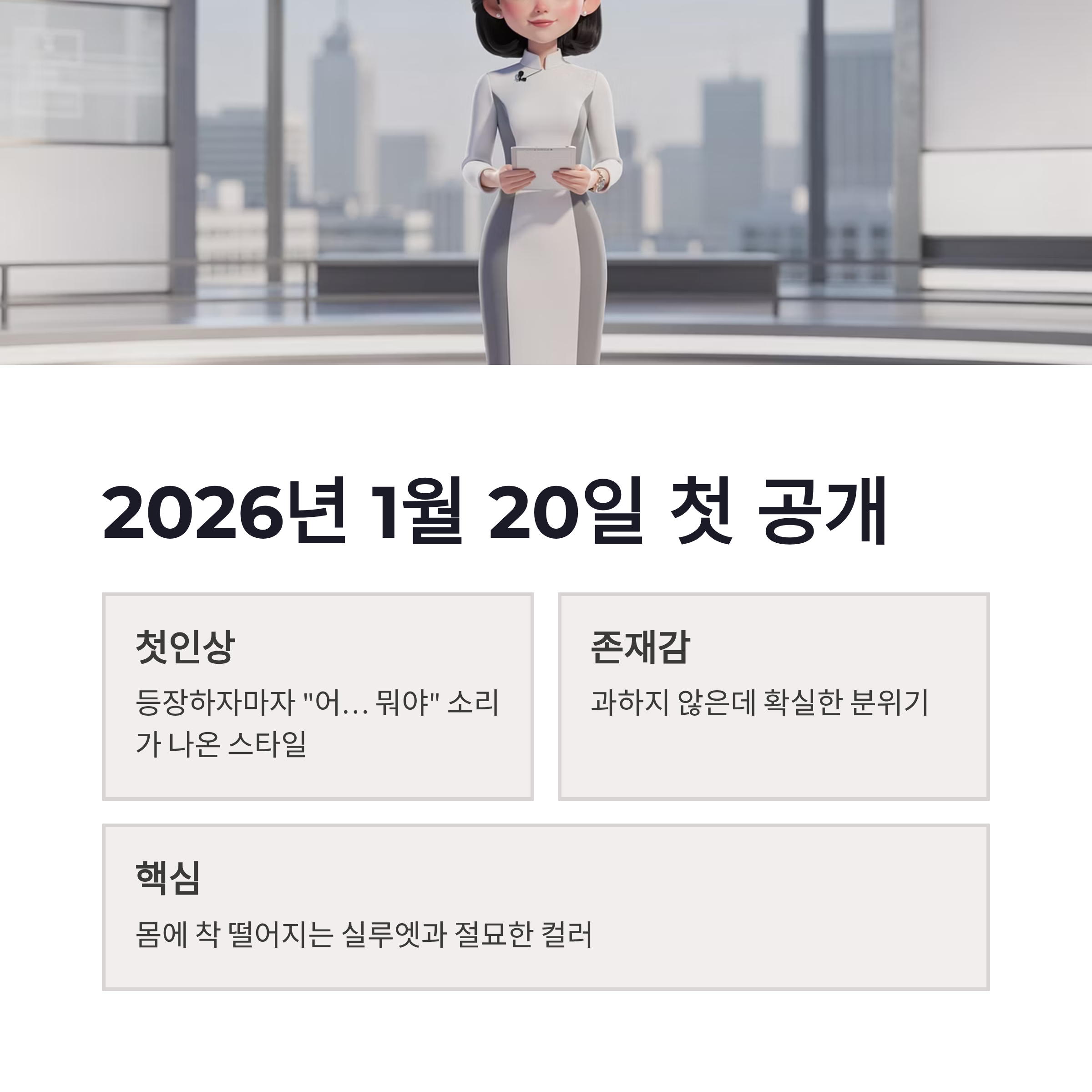 | 구분 | 포인트 | 체감 느낌 | | -- | --------- | -------------- | | 상의 | 슬림한 라인 | 화면에서 비율 강조 | | 컬러 | 저채도 계열 | 세트장과 자연스럽게 어울림 | | 소재 | 광택 최소화 | 조명 반사 없이 고급스러움 | | 핏 | 과하지 않은 밀착 | 부담 없고 세련됨 |
