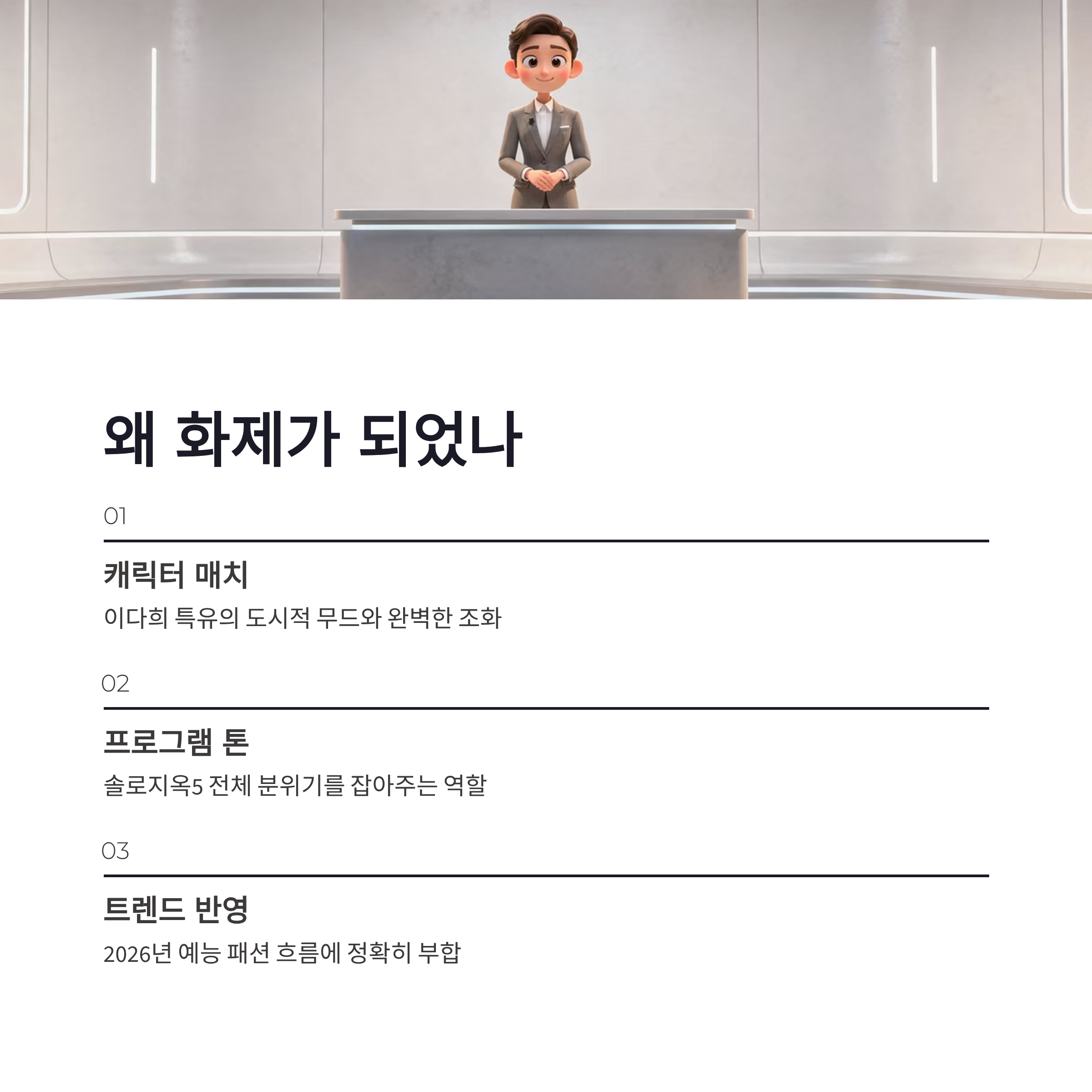 요즘 예능 MC 패션 흐름을 보면 ‘튀는 옷’보다는 캐릭터랑 어울리는 스타일이 대세인데요. 솔로지옥5 이다희 착장은 딱 그 흐름에 맞아떨어졌습니다. 장점은 명확해요. 세련됐고, 과하지 않고, 시즌 전체 톤을 잡아주는 역할까지 합니다. 단점이라면… 화려한 스타일 기대한 분들에겐 살짝 심심하게 느껴질 수도 있겠죠. 그래도 프로그램 성격 생각하면 이 선택이 맞았던 것 같아요. 실제로 이다희가 화면에 나올 때마다 분위기가 안정되더라구요.