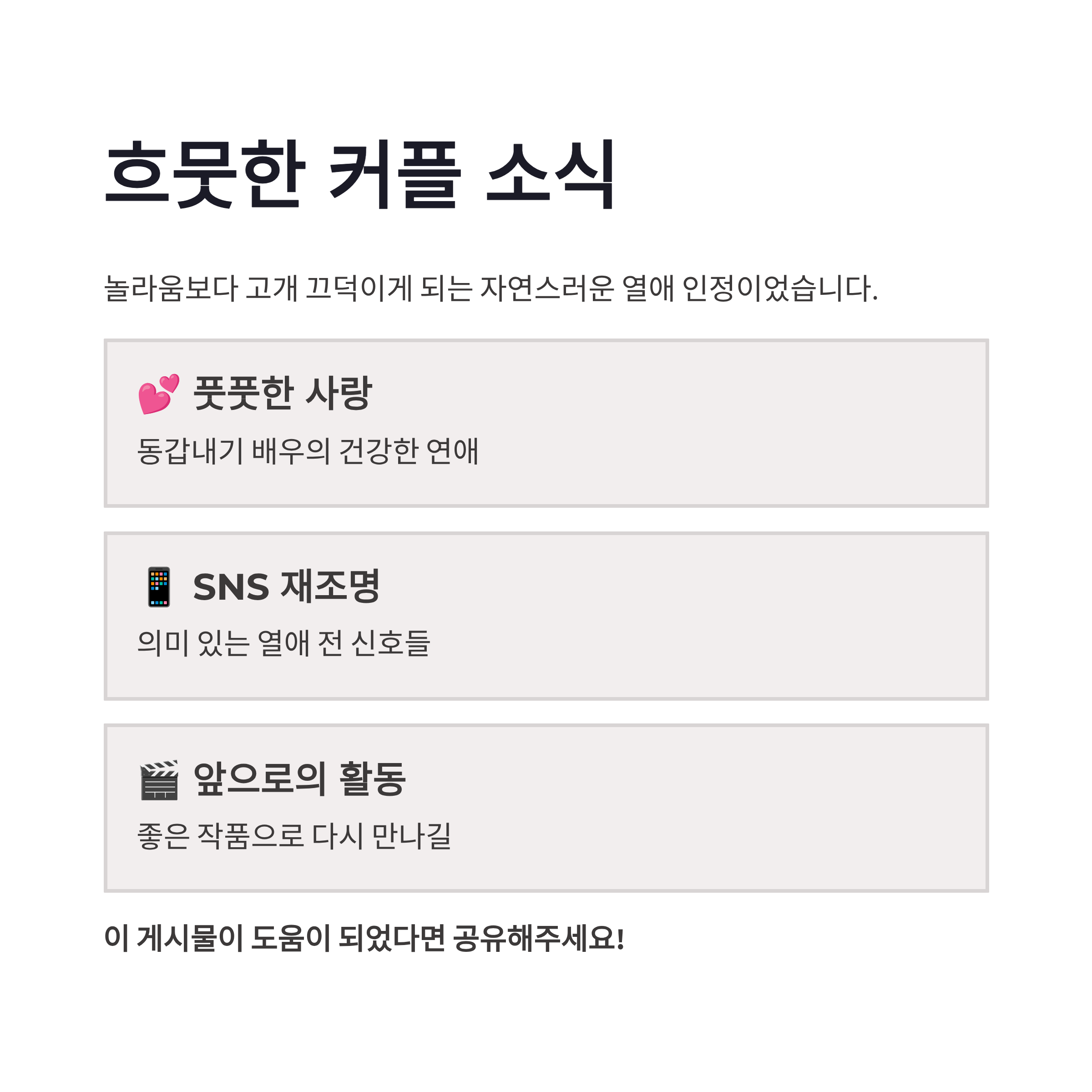 정리해보면 신은수 유선호 열애는 놀라움보다는 고개 끄덕이게 되는 소식이었습니다. SNS 속 작은 신호들이 뒤늦게 의미를 얻었고, 공식 인정 이후에도 차분한 행보를 이어가고 있구요. 개인적으로는 두 배우 모두 연기력으로 평가받아온 만큼, 연애 때문에 흔들리지 않고 더 좋은 작품에서 만났으면 하는 바람이 큽니다. 괜히 흐뭇해지는 커플 소식이었네요.