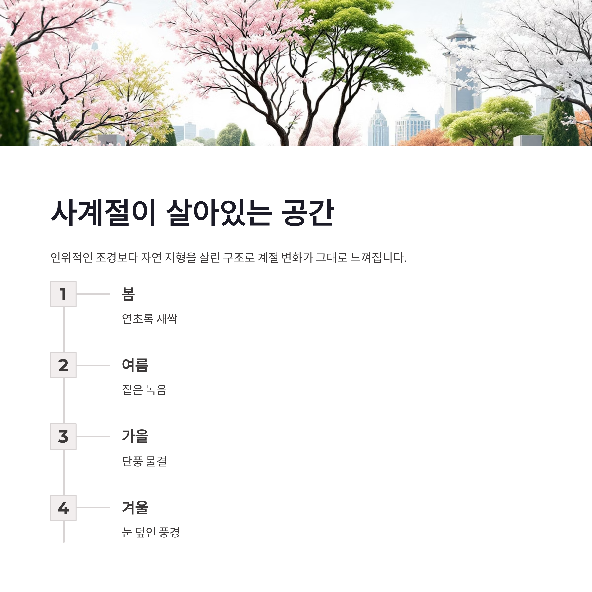양평 별그리다 추모공원은 경기도 양평군에 자리 잡고 있어서 서울·수도권에서 접근성이 꽤 괜찮은 편이에요. 차로 이동하면 복잡한 도심을 벗어나 점점 풍경이 바뀌는데, 그 순간부터 마음이 좀 가라앉더라구요. 이곳의 가장 큰 특징은 ‘조용함’이에요. 시끄러운 관광지가 아니라, 진짜 쉼에 가까운 느낌. 특히 인위적인 조경보다는 자연 지형을 살린 구조라서 계절 변화가 그대로 느껴져요. 봄엔 연초록, 여름엔 짙은 녹음, 가을엔 단풍, 겨울엔 눈 덮인 풍경까지… 고인을 떠올리기에 과하지도, 부족하지도 않은 분위기가 참 인상적이었구요.