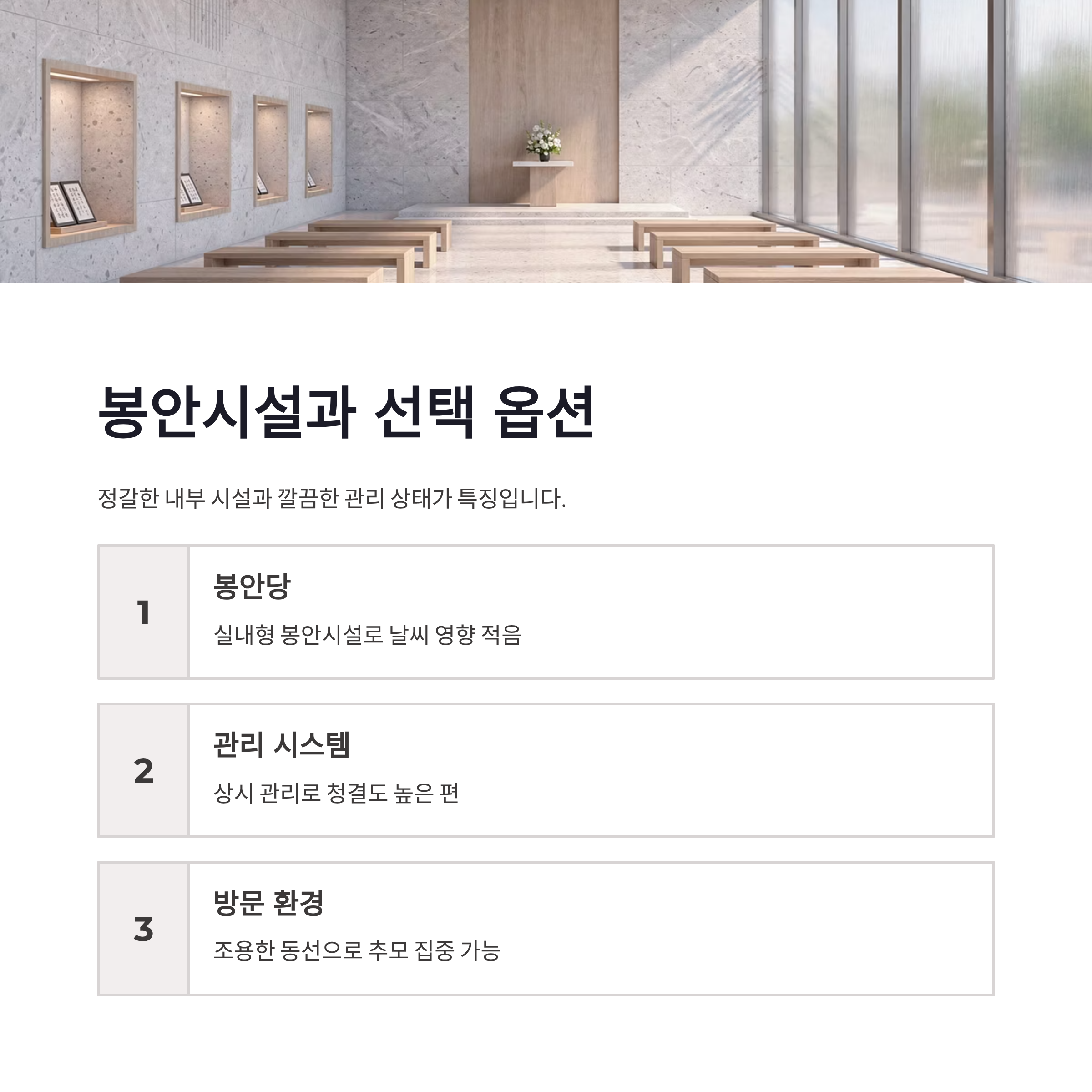 | 봉안당 | 실내형 봉안시설 | 날씨 영향 적음 |