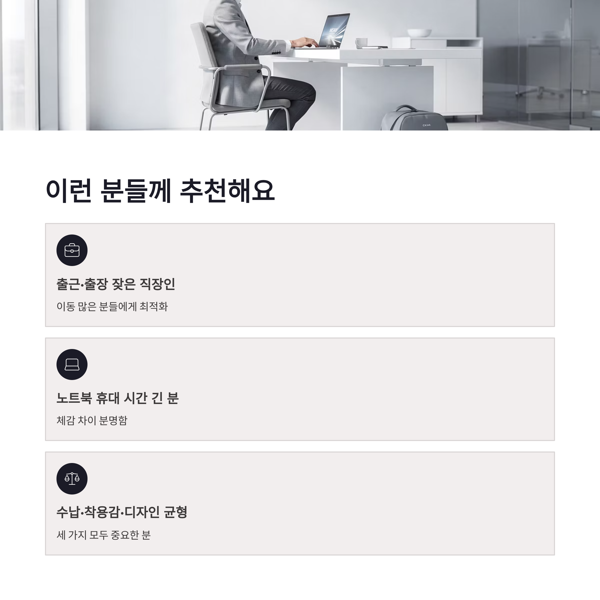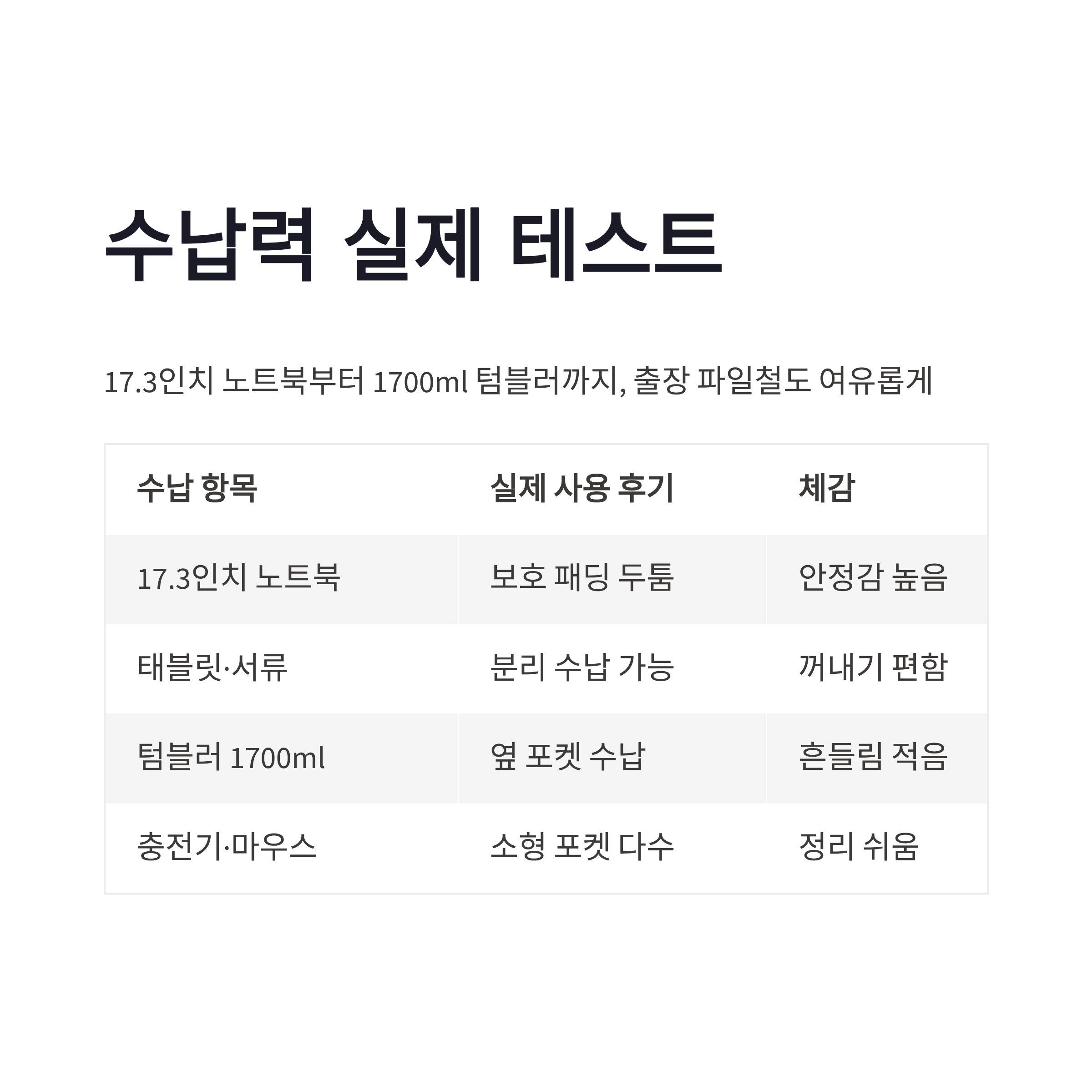 | 태블릿/서류 | 분리 수납 가능 | 꺼내기 편함 |