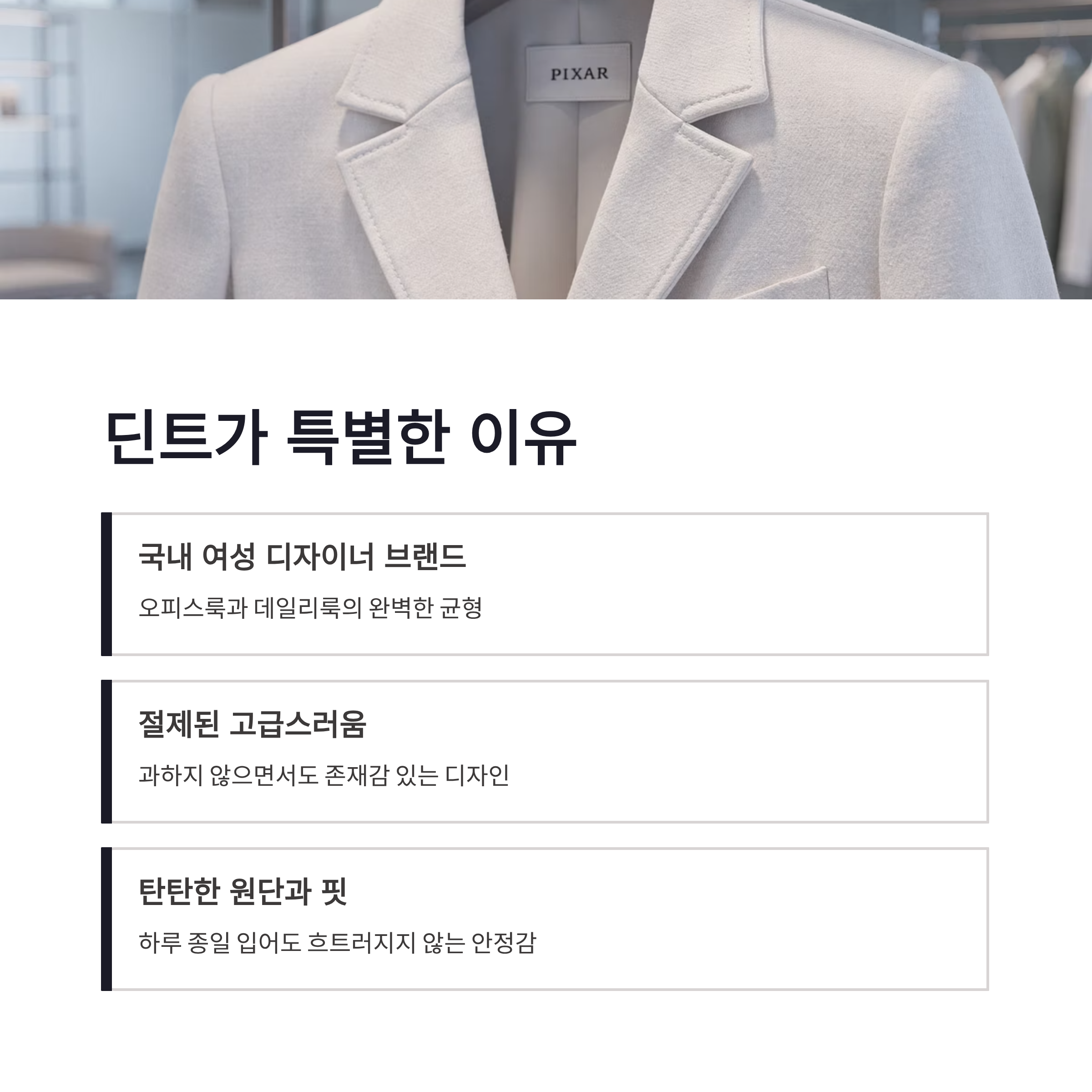 딘트는 국내 여성 디자이너 브랜드로, 오피스룩과 데일리룩 사이를 되게 영리하게 파고들어요. 올드머니룩 좋아하는 분들이 딘트를 찾는 이유도 여기 있더라구요. 실제로 제가 자주 입는 기준으로 정리해보면 이렇습니다.