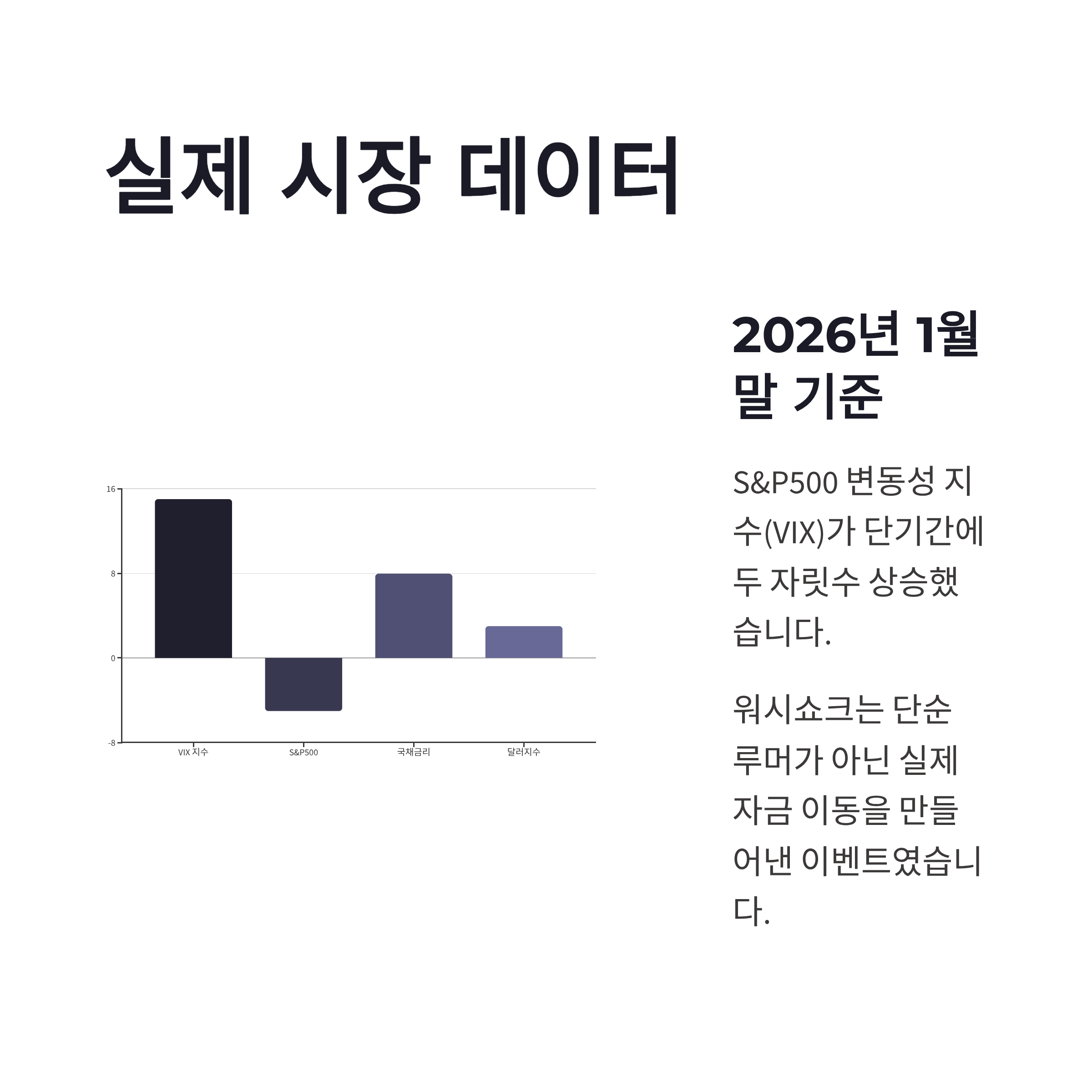 2026년 1월 말 기준, S&P500 변동성 지수(VIX)가 단기간에 두 자릿수 상승했다는 점도 꽤 상징적이었구요. 워시쇼크는 단순 루머가 아니라, 실제 자금 이동을 만들어낸 이벤트였던 셈입니다.