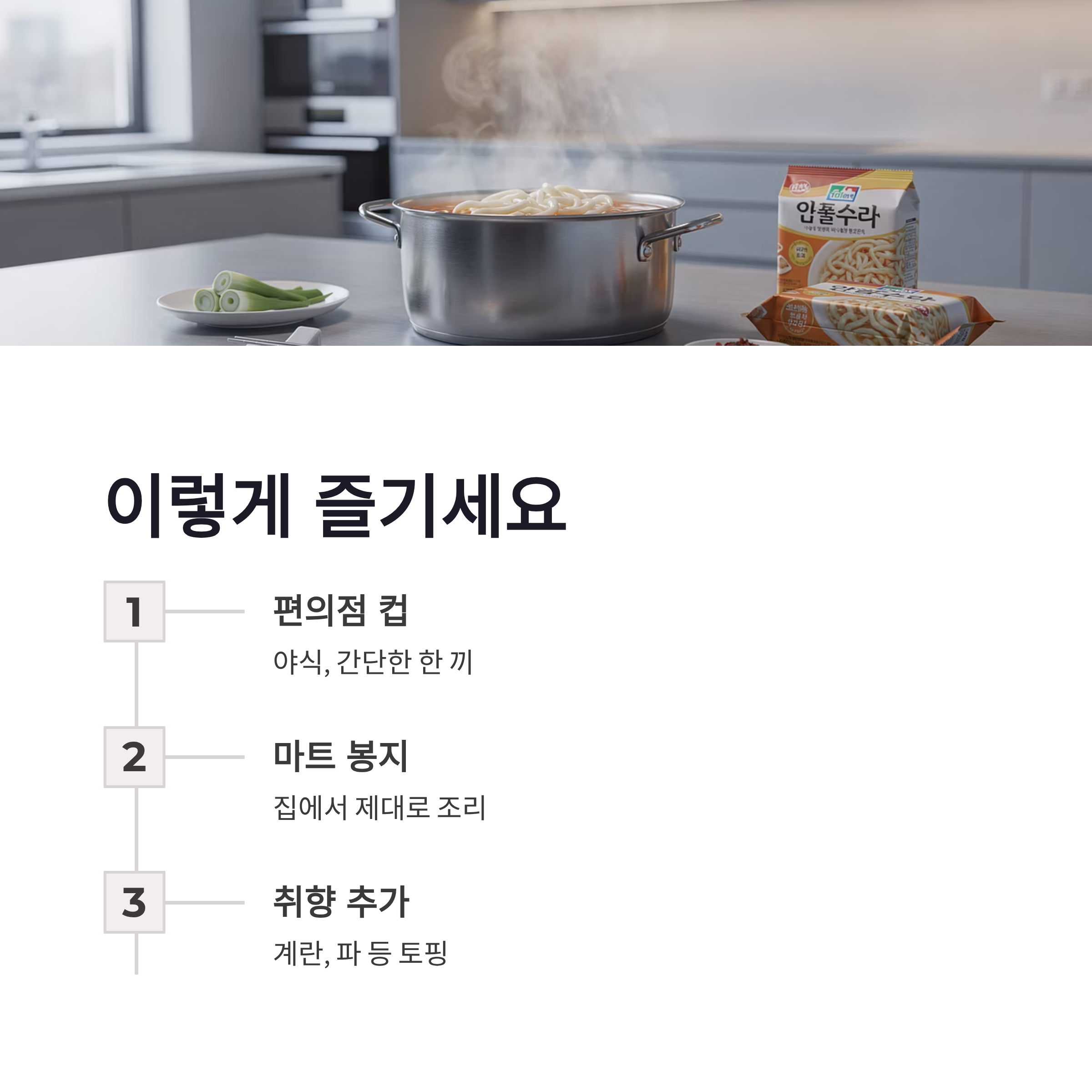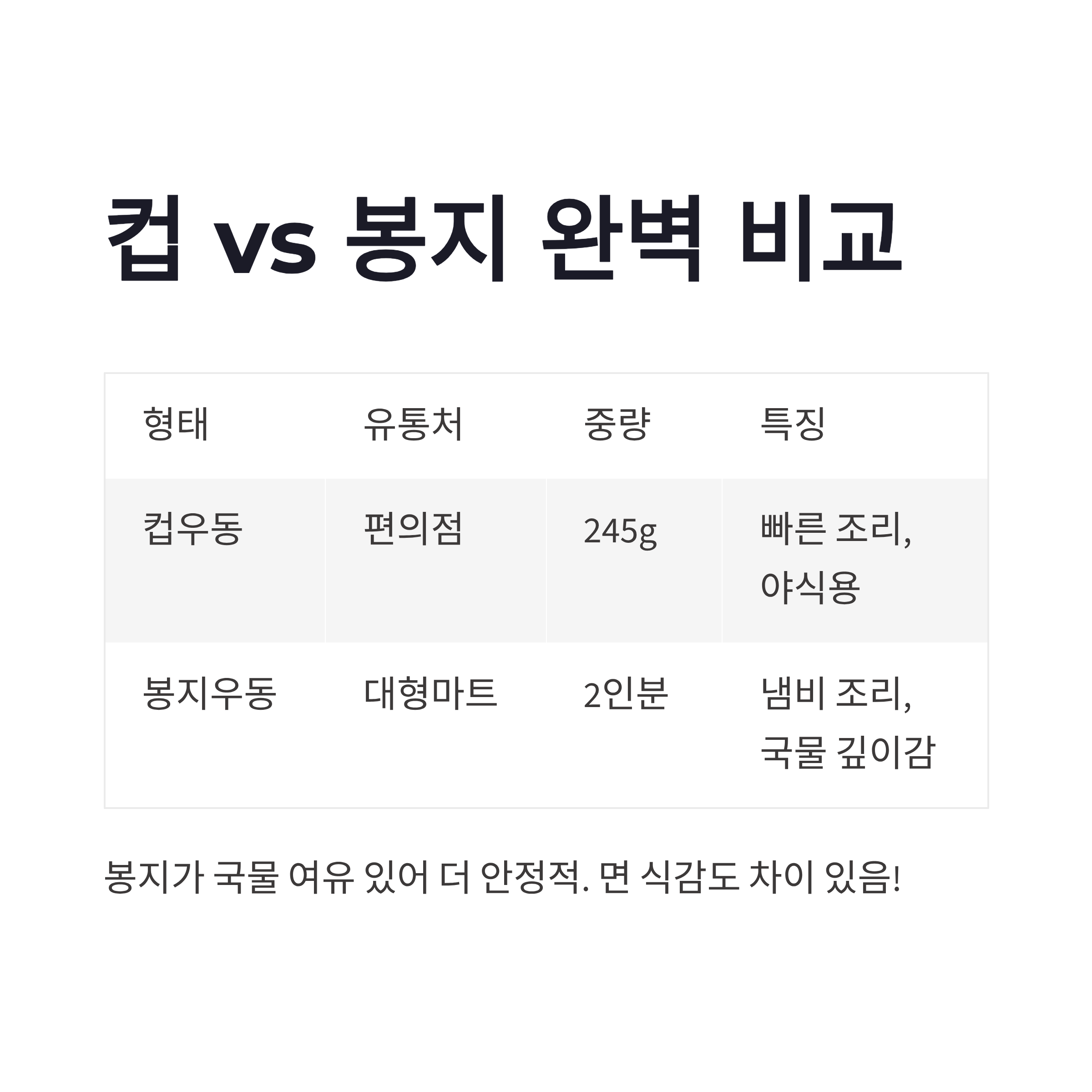 | 구분 | 유통처 | 형태 | 중량 | 특징 | | -- | ---- | ---- | ------ | -------------- | | 컵 | 편의점 | 컵우동 | 약 245g | 빠른 조리, 가벼운 한 끼 | | 봉지 | 대형마트 | 봉지우동 | 약 2인분 | 냄비 조리, 국물 깊이감 |