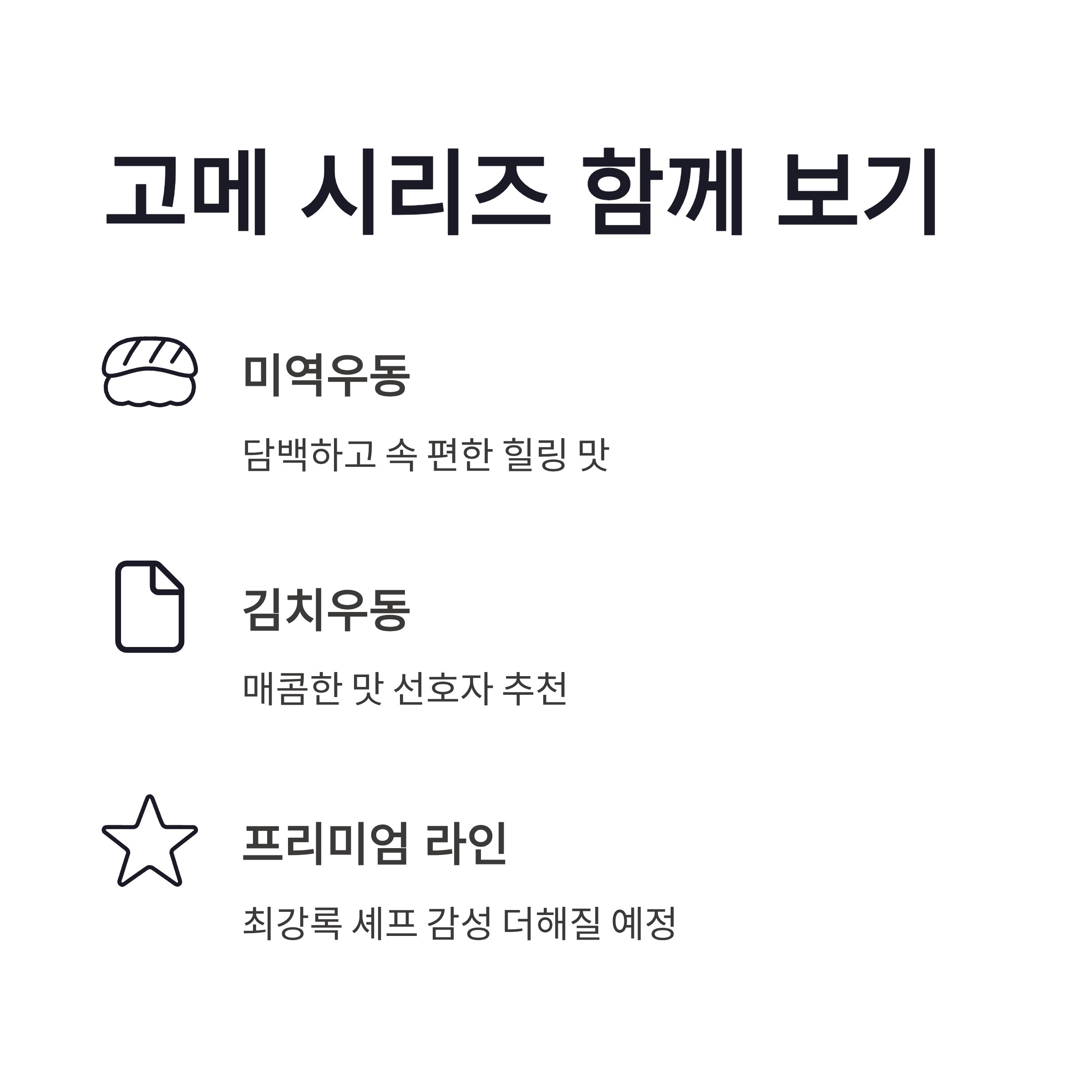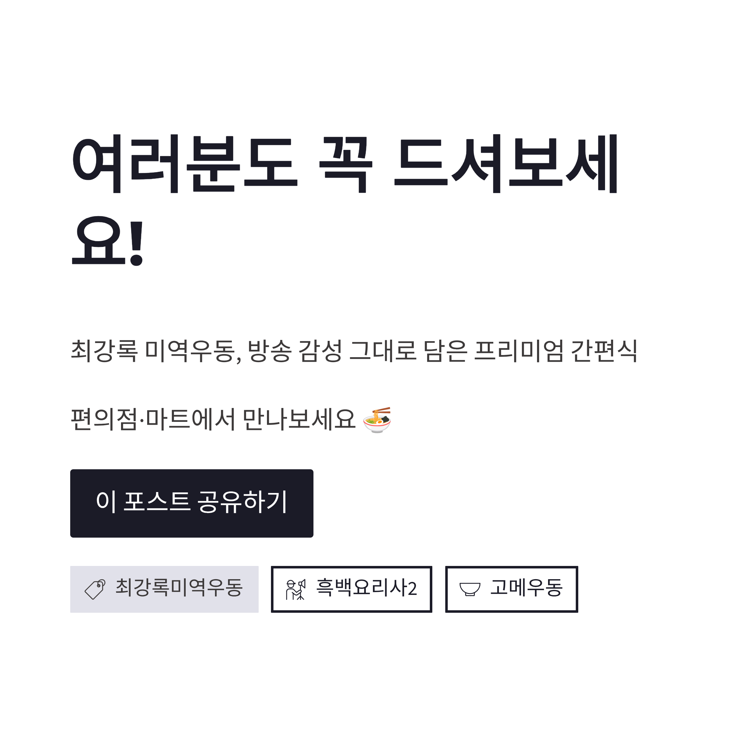 정리해보면 최강록 미역우동은 방송 화제성만 믿고 나온 제품은 아니었구요. 일상에 녹이기 쉬운 맛, 그게 제일 큰 장점이었습니다. 편의점 컵으로 가볍게, 마트 봉지로는 제대로. 이렇게 나눠서 즐기기 괜찮았어요. 앞으로 고메 시리즈에 최강록 셰프 색이 더 얹히면 또 재미있을 것 같더라구요 ㅎㅎ 저는 재구매 의사 있음다!