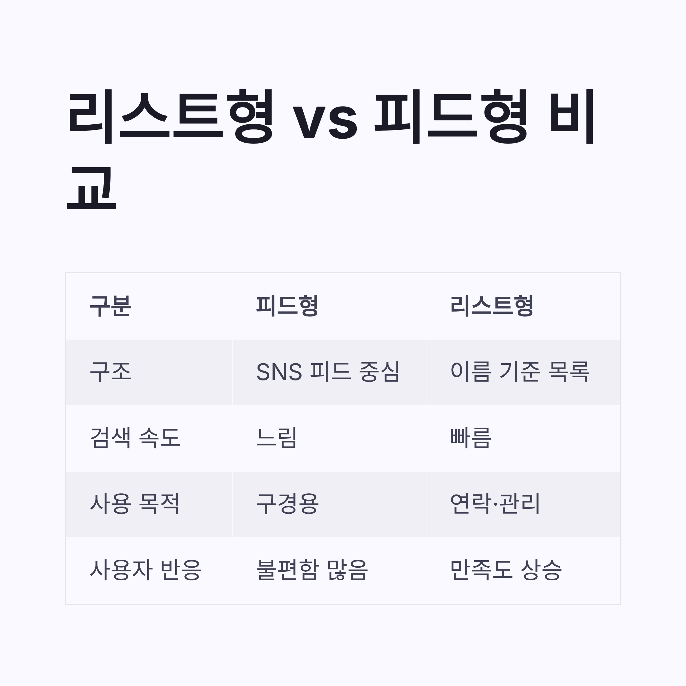 | 구조 | SNS 피드 중심 | 이름 기준 목록 |