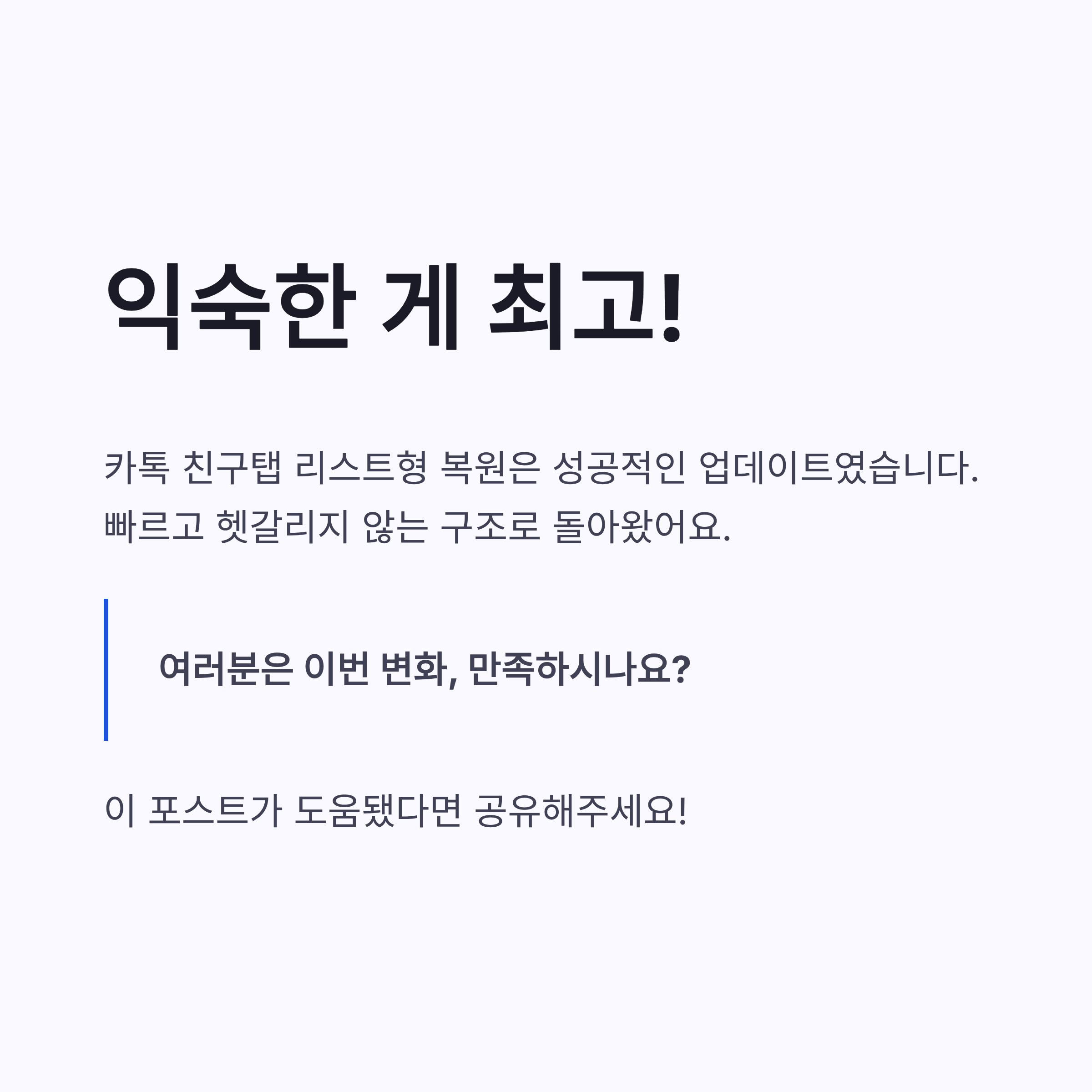 정리해보면 카톡 친구탭 리스트형 복원은 사용자 입장에서 거의 환영할 만한 업데이트였어요. 빠르고, 헷갈리지 않고, 예전처럼 자연스럽게 손이 가는 구조라서요. 괜히 바뀌어서 스트레스 받느니, 이렇게 익숙한 게 오래 가는 게 최고인 것 같더라구요 ㅎㅎ 여러분은 이번 카톡 친구탭 변화, 만족하시나요? 써보니까 예전이 더 편하던가요, 아니면 지금이 더 나은가요?