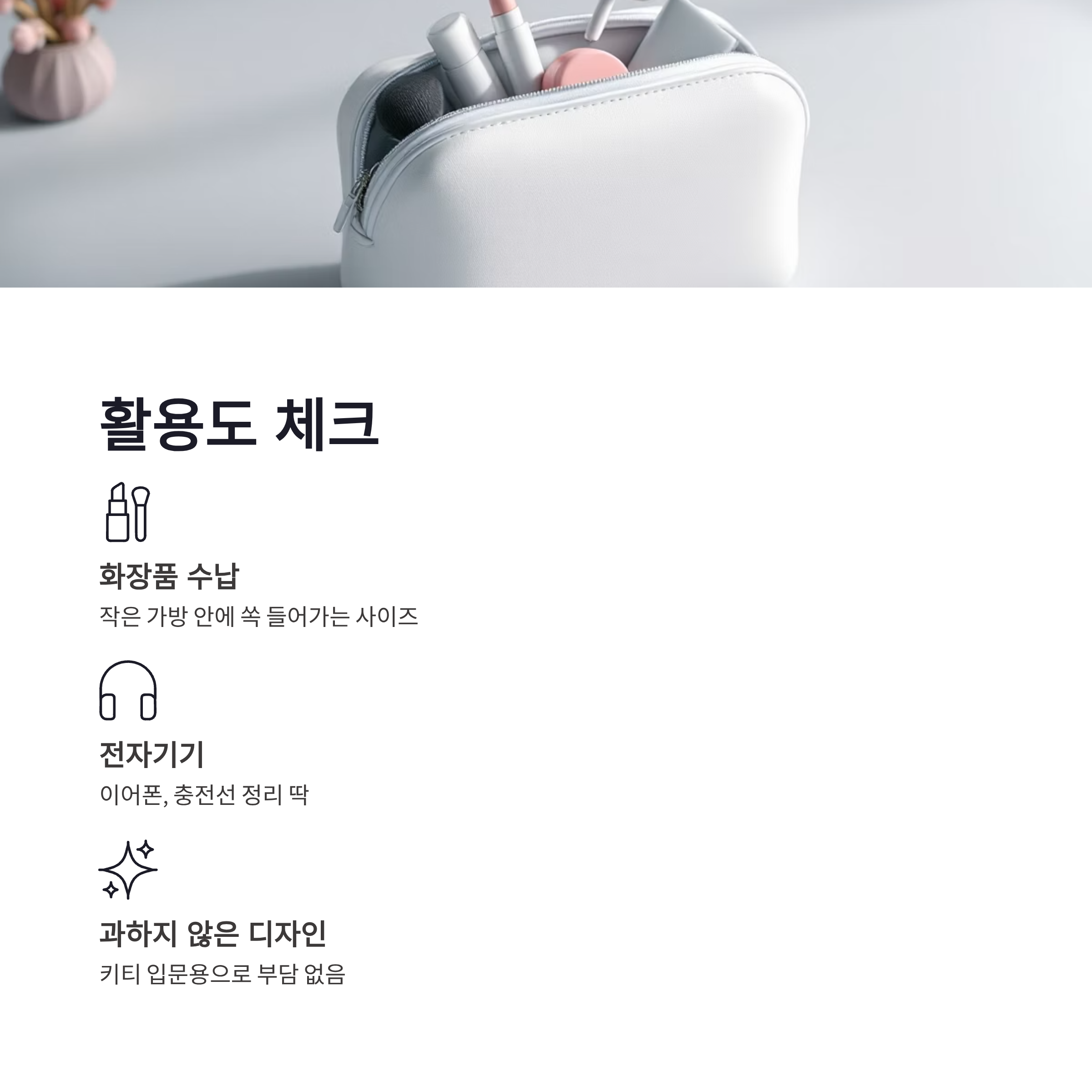 파우치는 작은 가방 안에 쏙 들어가는 크기라 화장품이나 이어폰, 충전선 넣기 딱이었구요. 디자인도 과하지 않아서 키티 콜라보 입문용으로도 부담 없겠더라구요.