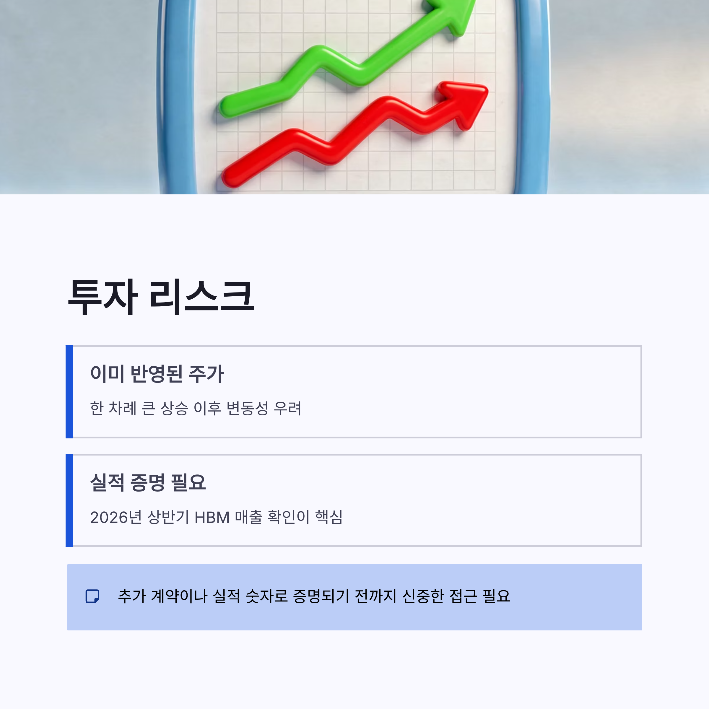 단점은 딱 하나. 이미 주가가 한 차례 크게 움직였다는 점. 추가 계약이나 실적 숫자로 증명되기 전까지는 변동성 장난 아닐 수 있습니다. 2026년 상반기 실적에서 HBM 매출이 실제로 찍히는지, 이게 핵심 체크 포인트 같더라구요.