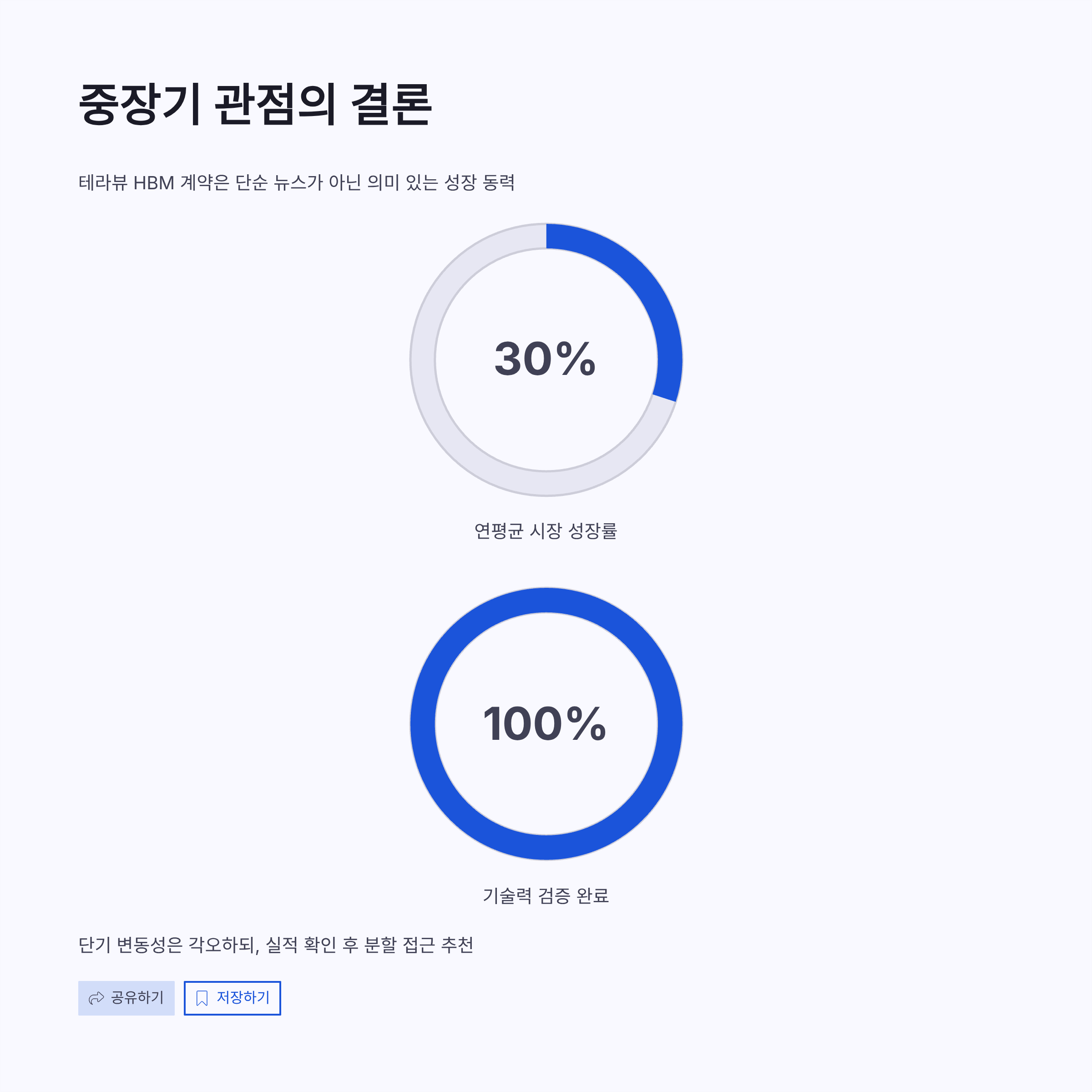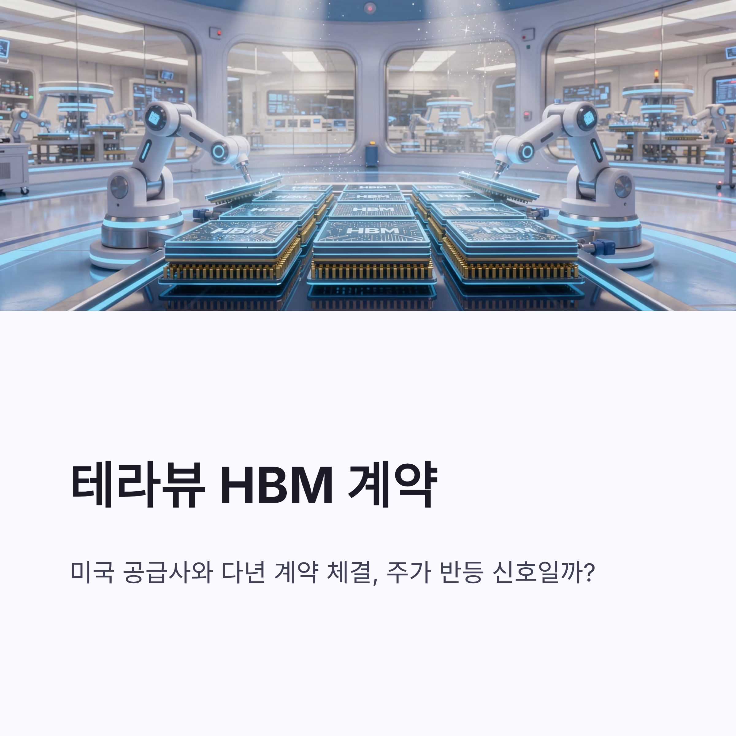 그런데 이 흐름 뒤에 테라뷰 HBM 계약이라는 재료가 깔려 있었던 겁니다. 미국 HBM 공급사와 다년간 계약 체결. 이 한 줄이 왜 중요하냐면, 단발성 공급이 아니라 중장기 매출 가시성이 생겼다는 신호라서 그래요. 솔직히 이런 계약은 아무 회사나 못 맺습니다. 기술 검증을 통과했다는 얘기거든요.