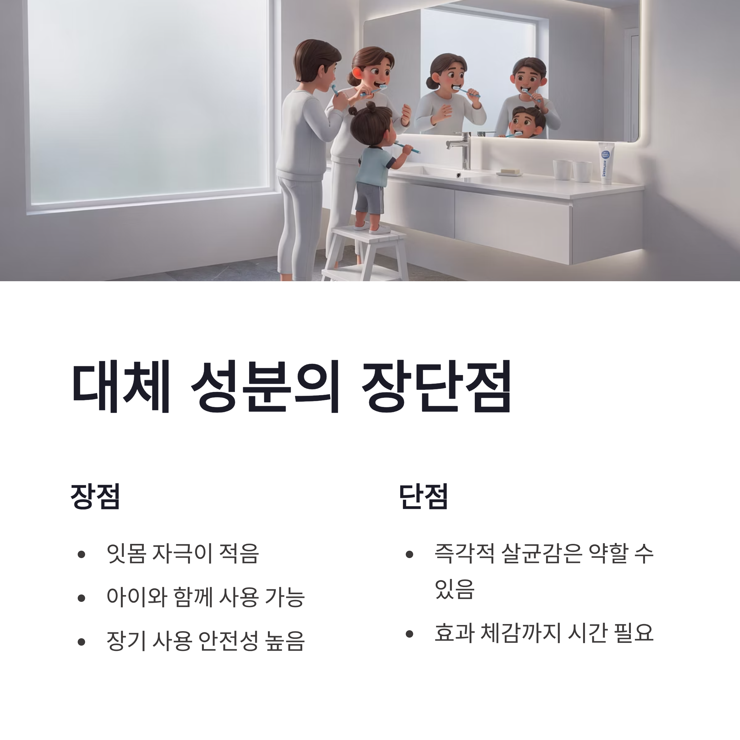 요즘 흐름은 꽤 명확합니다. 무조건 강한 살균보다는, 자극 적고 장기 사용 가능한 성분 쪽으로 가는 중이에요. 예를 들면 자일리톨, 프로폴리스, 녹차추출물 같은 성분들이 대체로 많이 쓰이고 있고요. 장점은 잇몸 자극이 덜하고 아이랑 같이 써도 비교적 안심된다는 점! 단점이라면 즉각적인 살균 느낌은 예전 트리클로산 치약보다 약하게 느껴질 수 있다는 정도랄까요. 그래도 매일 쓰는 거니까 저는 이쪽이 마음이 편했어요 ㅎㅎ