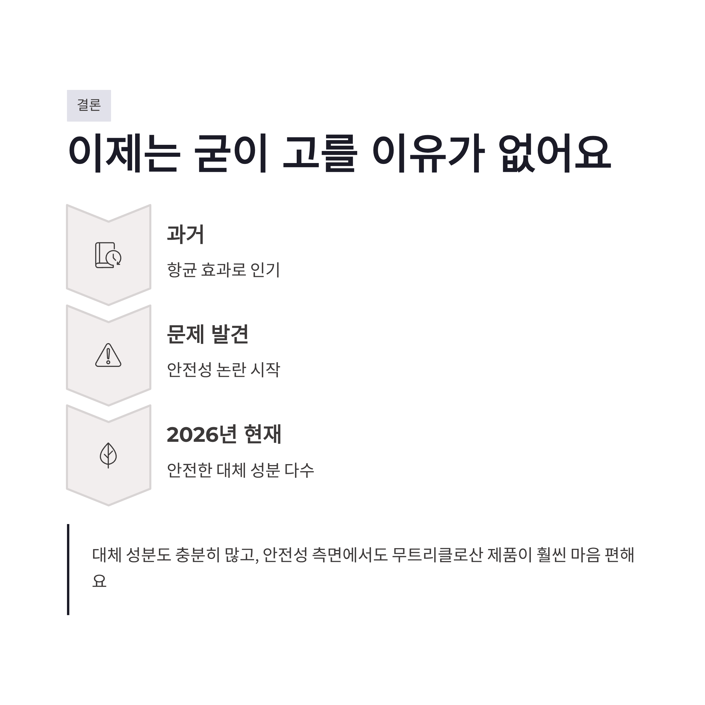 정리해보면, 트리클로산 치약은 과거엔 분명 장점이 있었지만 2026년 기준으로는 굳이 선택할 이유가 거의 없어졌다고 느꼈어요. 대체 성분도 충분히 많고, 안전성 측면에서도 무트리클로산 제품이 훨씬 마음 편하거든요. 치약 하나 바꾼다고 인생이 달라지진 않지만, 매일 쓰는 만큼 쌓이는 건 무시 못 하잖아요? 다음에 치약 살 때 성분표 한 번만 슬쩍 봐보세요. 생각보다 선택이 쉬워질지도 몰라요 ㅎㅎ
