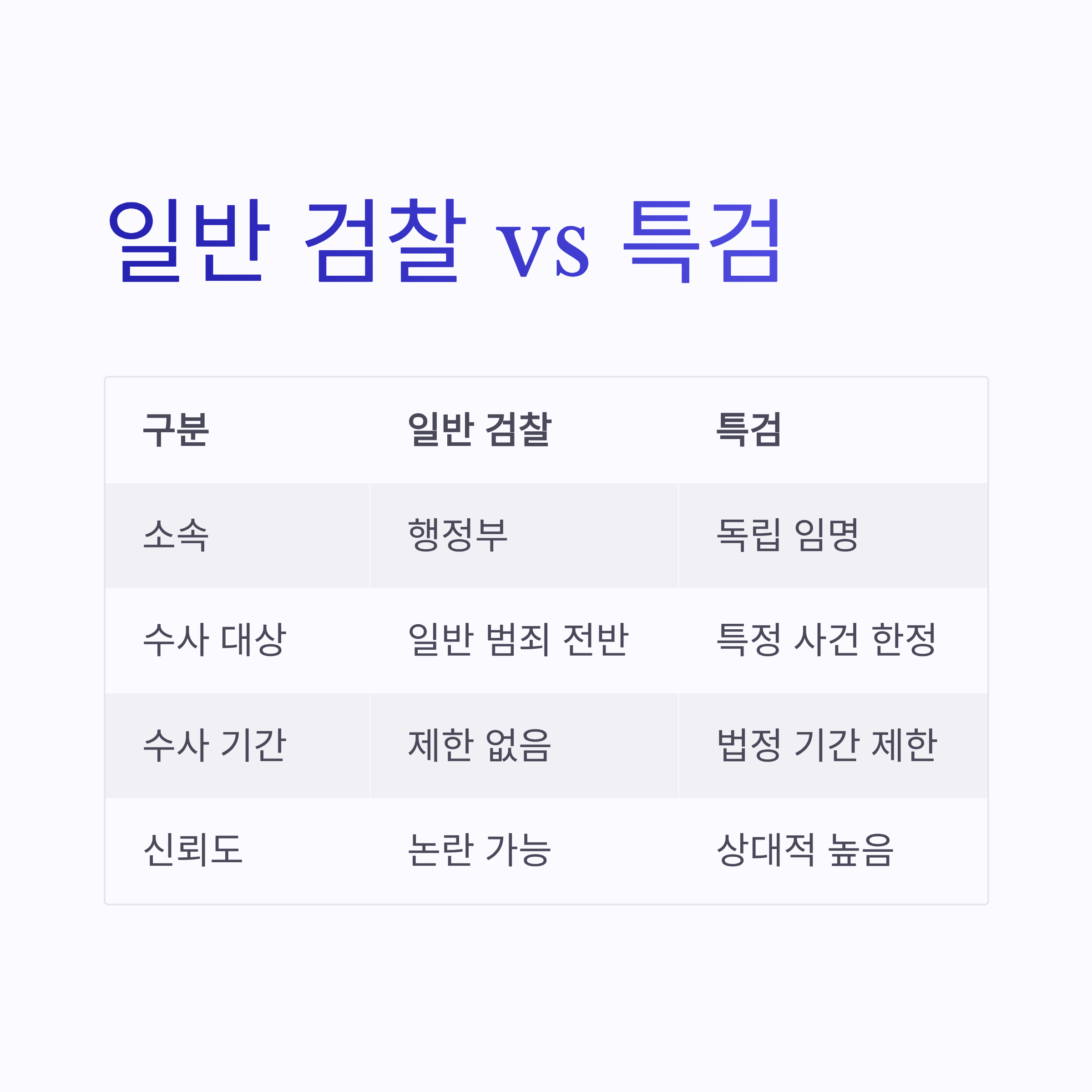 | 구분 | 일반 검찰 수사 | 특별검사(특검) |