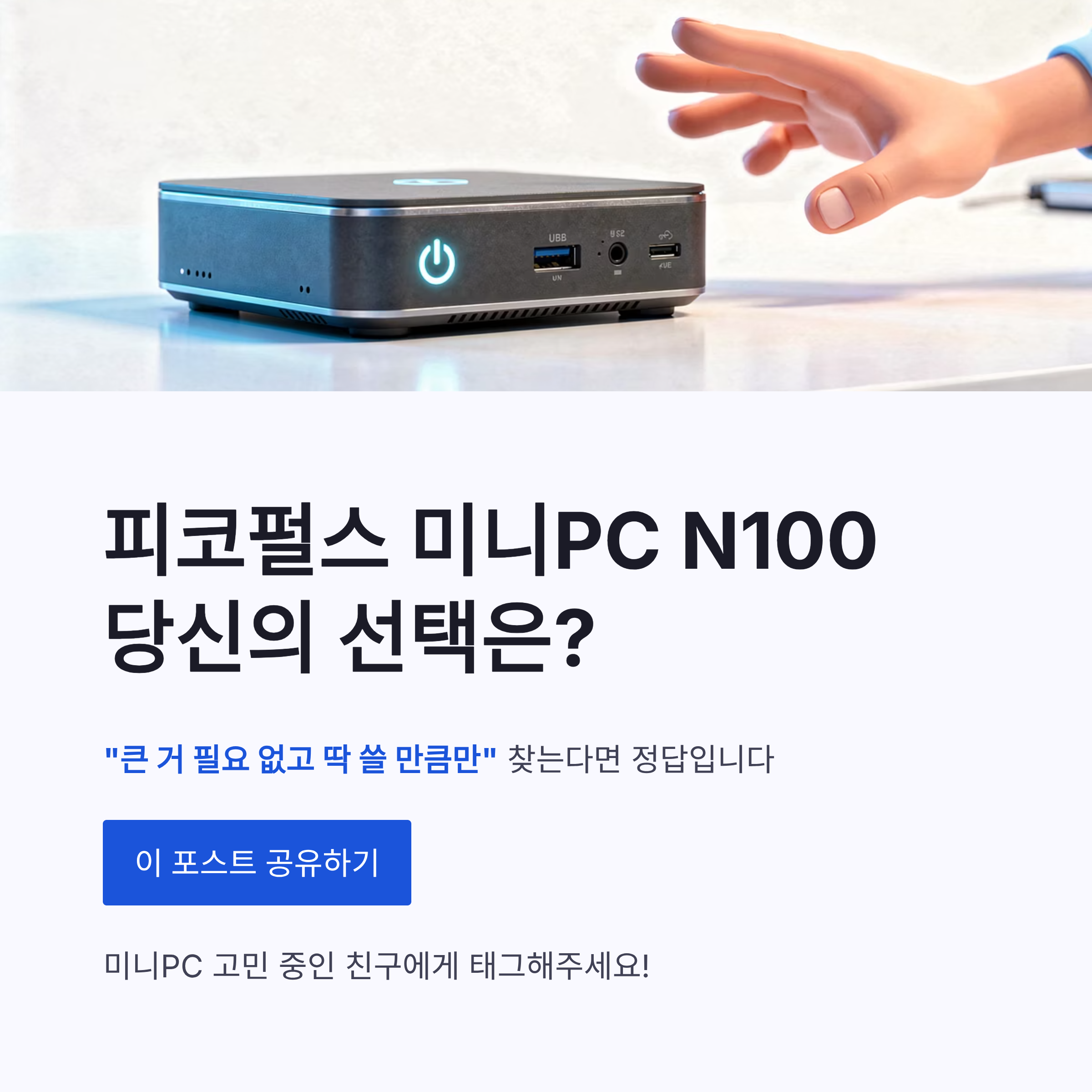 정리해보면 피코펄스 미니PC N100은 공간 부족, 예산 고민 있는 분들께 꽤 괜찮은 선택이었습니다. 책상 깔끔해지고, 노트북보다 발열·소음 적고, 전기세 부담도 덜하구요. 메인 PC까지는 아니어도 서브나 사무용으로는 만족감이 높았어요. 저처럼 “큰 거 필요 없고 딱 쓸 만큼만” 찾는 분들한테 잘 맞을 듯합니다. 혹시 미니PC 고민 중이신가요? 이런 용도로 쓰실 건지 한번 생각해보셔도 좋겠쥬 ㅎㅎ
