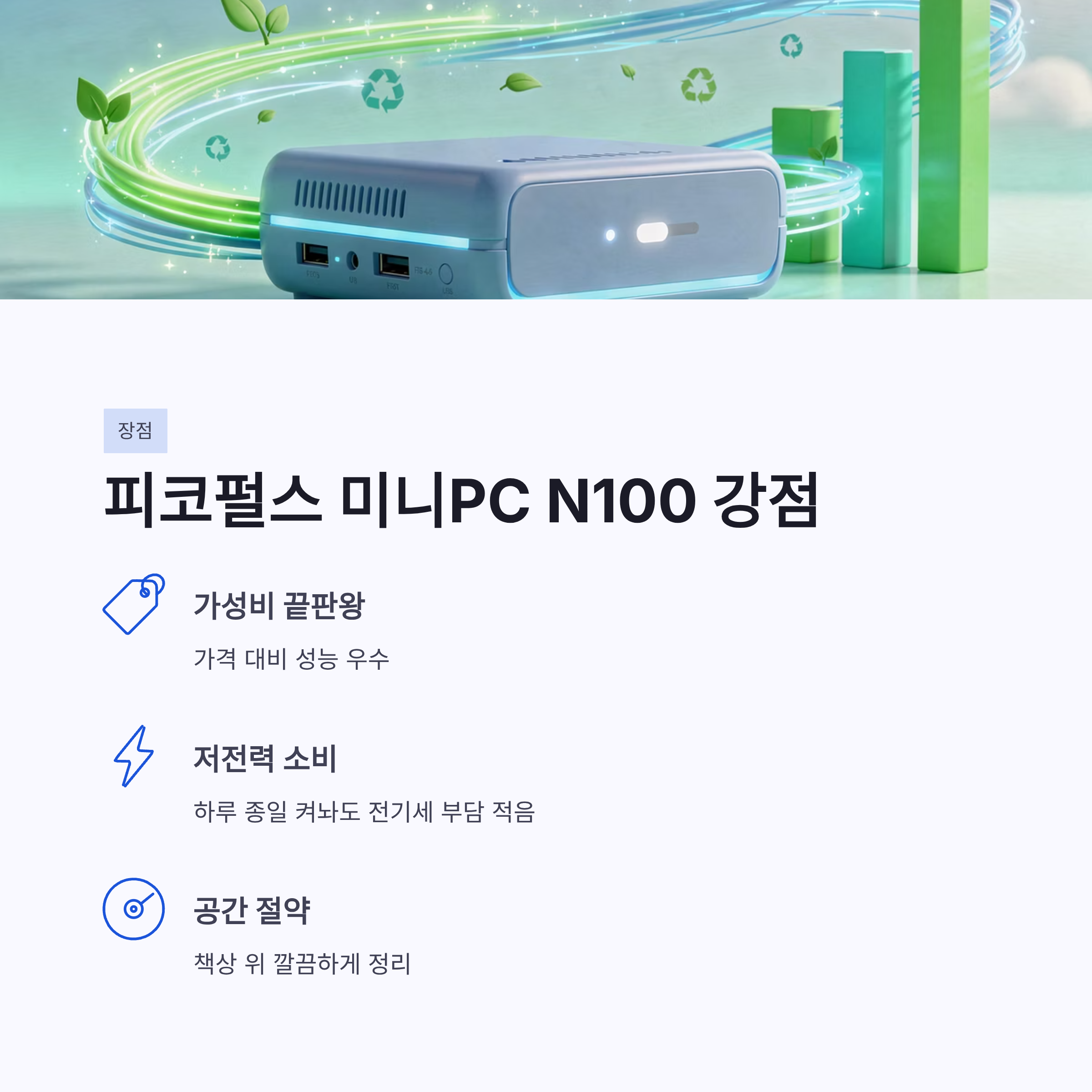 요즘 미니PC가 워낙 많잖아요. 그중에서 피코펄스 미니PC N100은 가성비 쪽에 확실히 강점이 있어요. 가격 대비 성능이 괜찮고 전력 소모도 적은 편이라 하루 종일 켜놔도 부담이 덜합니다. 대신 고사양 게임이나 영상 편집용으로는 한계가 분명해요. 이건 솔직히 기대하면 안 됩니다. 하지만 사무, 학습, 영상 시청용이라면 장점이 훨씬 크게 느껴졌어요. “이 가격에 이 정도면 됐다” 이런 느낌이랄까용?