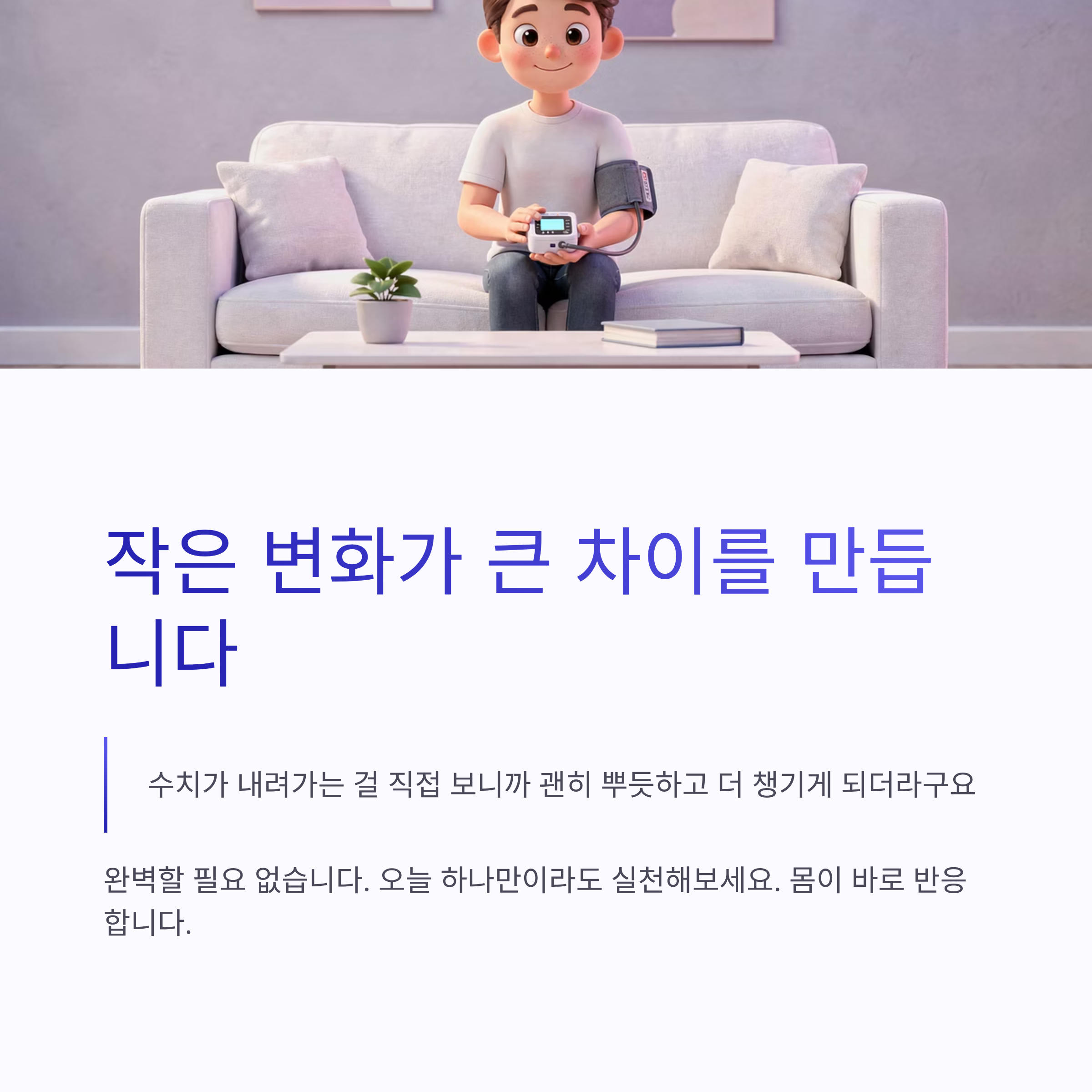 정리해보면 혈압 낮추는법은 진짜 별거 없어요. 덜 짜게 먹고, 조금 걷고, 스트레스 덜 받으려고 노력하는 거. 이 세 가지만 지켜도 몸이 바로 반응하더라구요. 저도 아직 완벽하진 않은데요, 그래도 수치가 내려가는 걸 직접 보니까 괜히 뿌듯하고 더 챙기게 되더라구요 ㅎㅎ 혹시 지금 혈압 때문에 살짝 걱정 중이신가요? 오늘 하나만이라도 실천해보는 거, 어떠신지요? 작은 변화가 생각보다 큽니다!