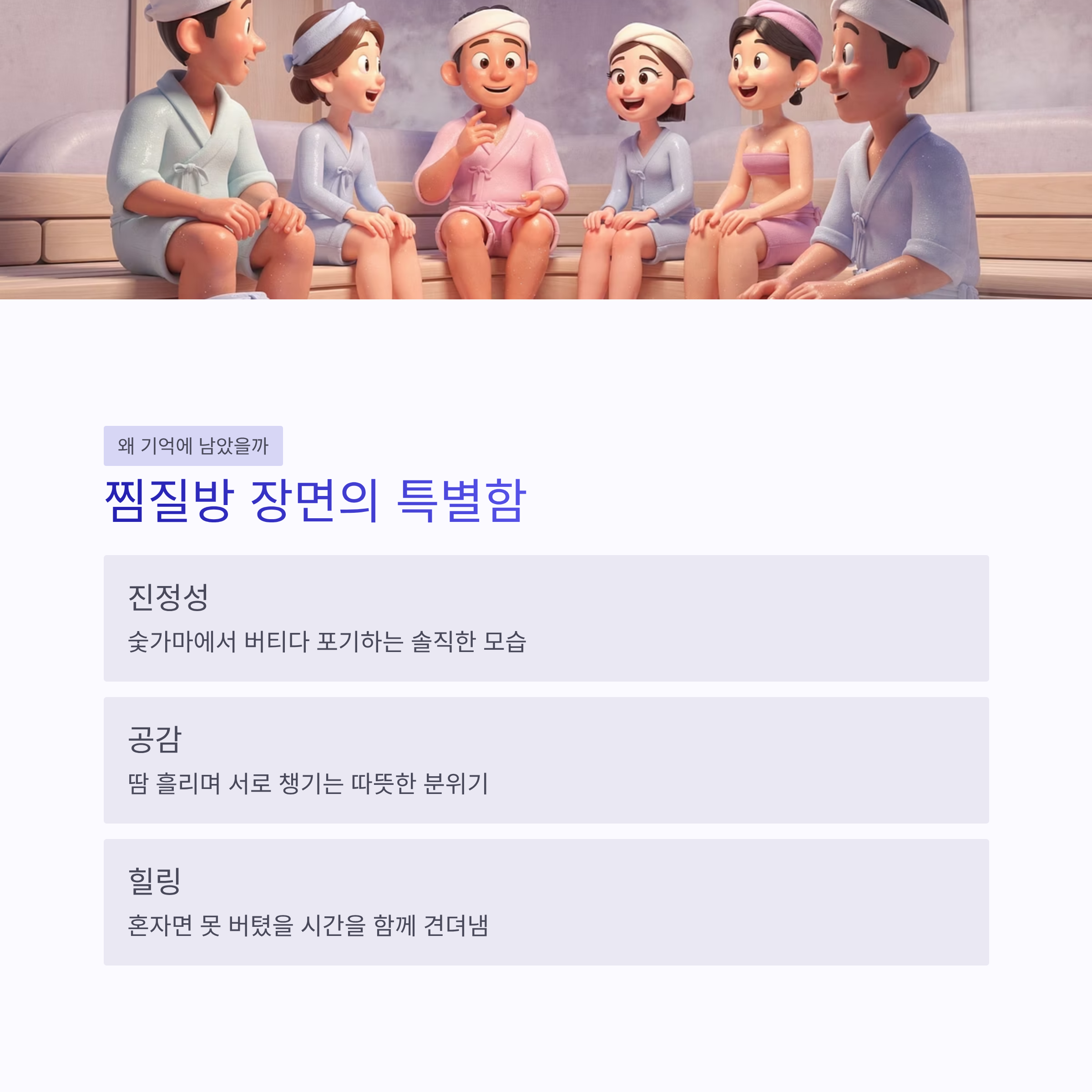 정리해보면 혼자는 못해 찜질방은 단순한 촬영지가 아니라, 프로그램 메시지를 제대로 보여준 공간 같았어요. 혼자면 포기했을 걸 함께라서 해내는 순간들, 그게 숯가마라는 장소랑 잘 맞아떨어졌구요. 다음 회차에서는 또 어떤 장소가 나올지 괜히 기대되네요. 여러분은 이 찜질방 장면 보면서 어떤 생각 들었나요? 나중에 실제로 가보고 싶다는 생각 들지 않던가요 ㅎㅎ
