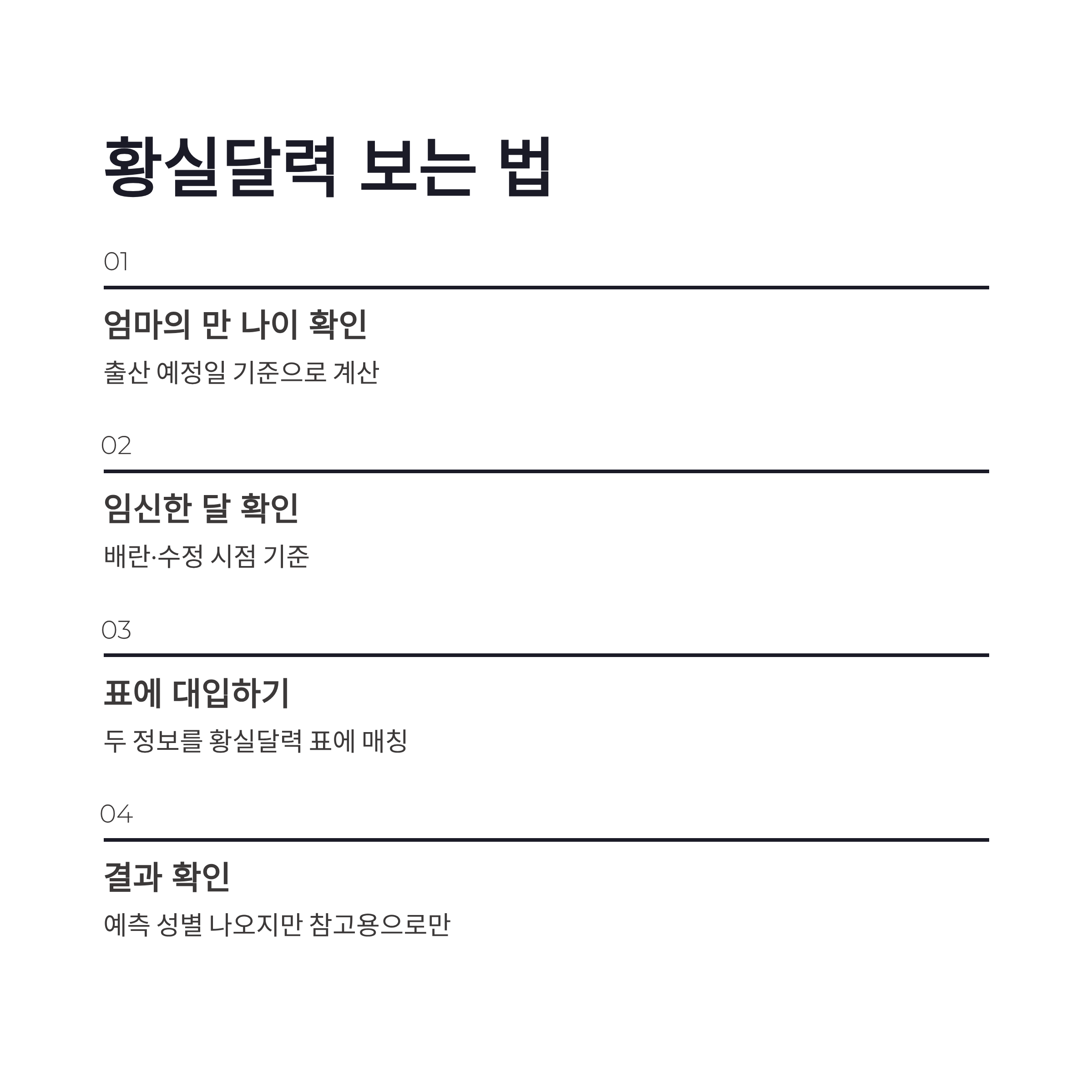 | 구분 | 확인 내용 | 체크 포인트 | | -- | -------- | ------------ | | 나이 | 엄마의 만 나이 | 출산 예정일 기준 | | 월 | 임신된 달 | 배란·수정 시점 기준 | | 결과 | 예측 성별 | 100% 아님, 참고용 |