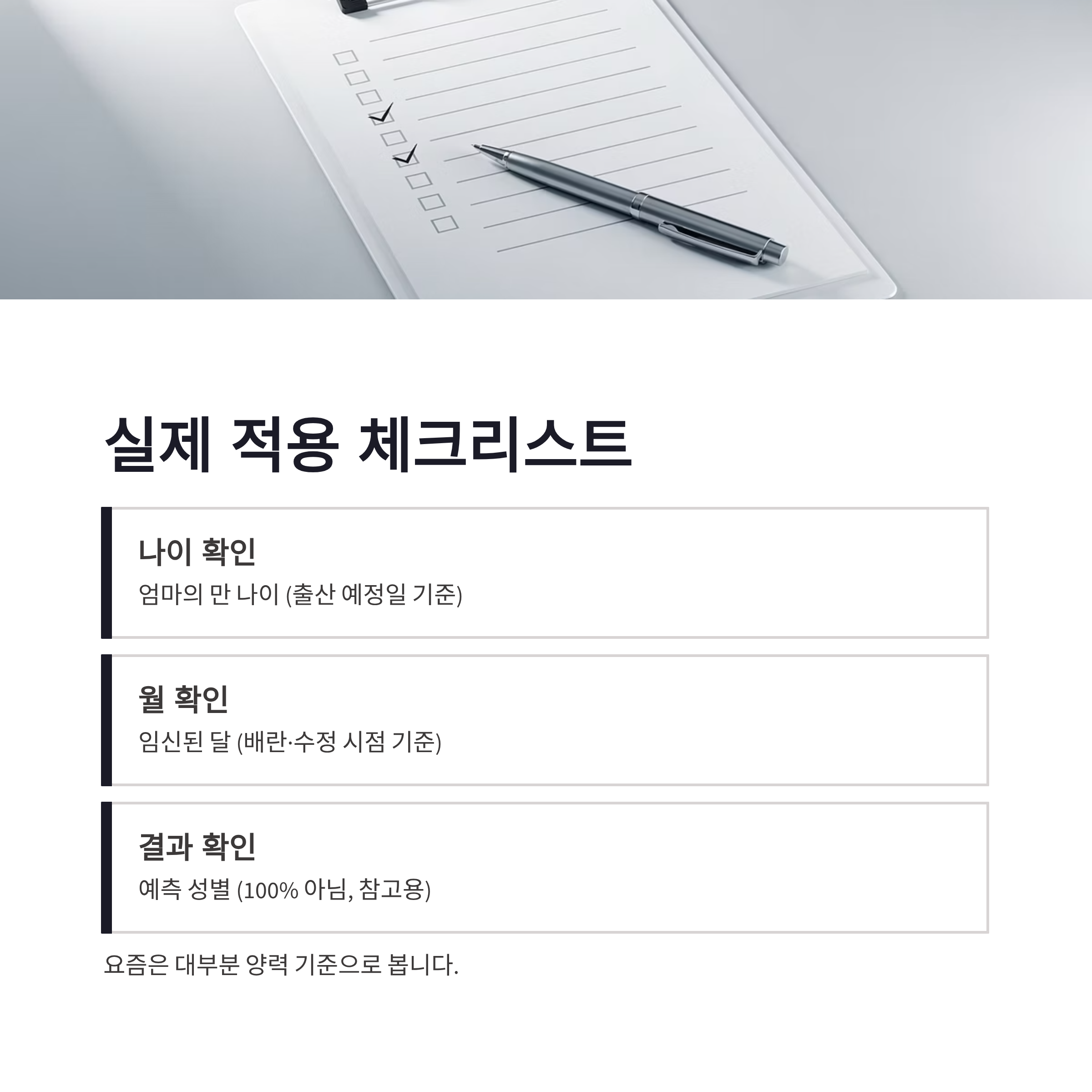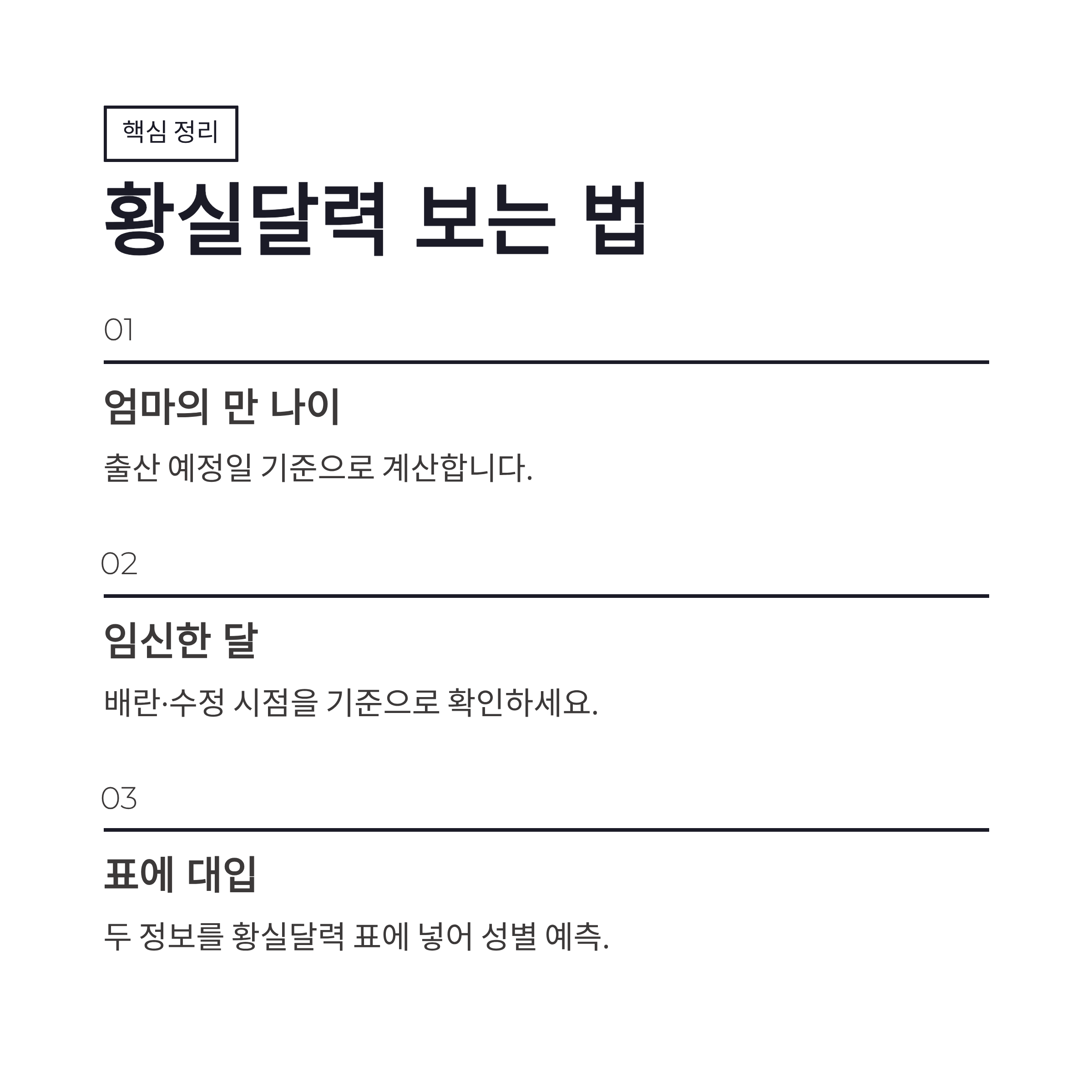 | 구분 | 확인 내용 | 체크 포인트 | | -- | -------- | ------------ | | 나이 | 엄마의 만 나이 | 출산 예정일 기준 | | 월 | 임신된 달 | 배란·수정 시점 기준 | | 결과 | 예측 성별 | 100% 아님, 참고용 |