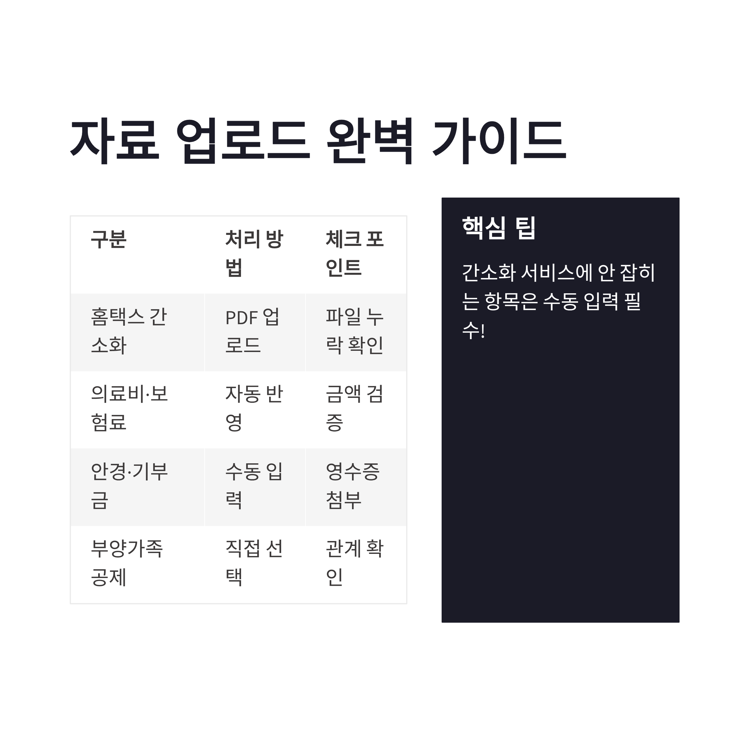 여기서 제일 중요한 구간이 자료 업로드였어요. 홈택스에서 받은 PDF를 그대로 YETA 간소화 자료 업로드 메뉴에 넣으면 됩니다. 근데 이게 끝이 아니더라구요. 간소화 서비스에 안 잡히는 항목들, 예를 들면 안경 구입비나 기부금 일부는 수동 입력 + 증빙 첨부가 필수였어요. 제가 헷갈렸던 부분을 표로 정리해보면 이렇슴다.