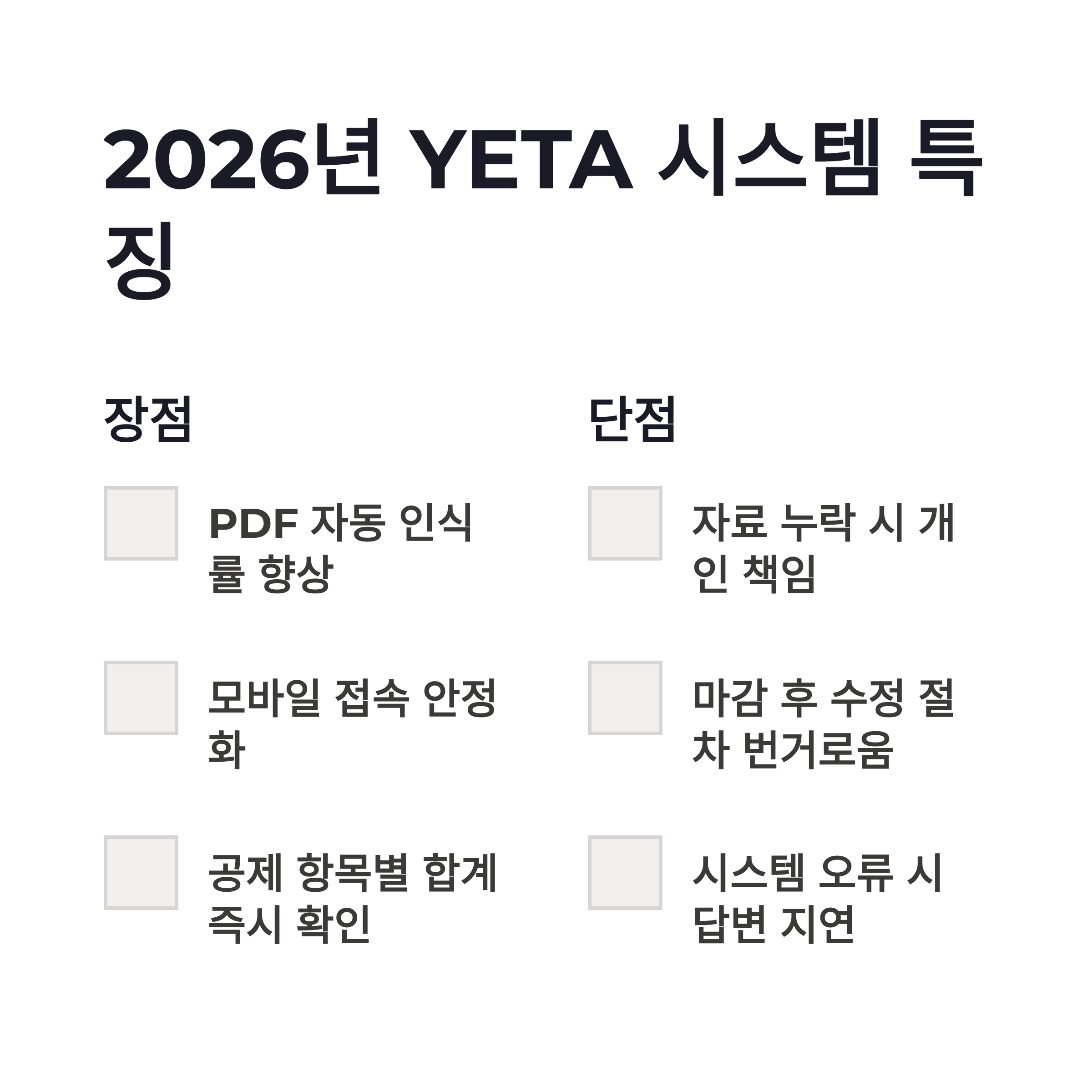 2026년 들어 느낀 변화는, 자동화는 늘고 책임은 개인에게 더 온 느낌이었어요. 회사에서 “시스템에 올렸으니 끝”이 아니라, 본인이 확인 안 하면 그대로 넘어가더라구요. YETA도 마찬가지. 장점부터 말하면,