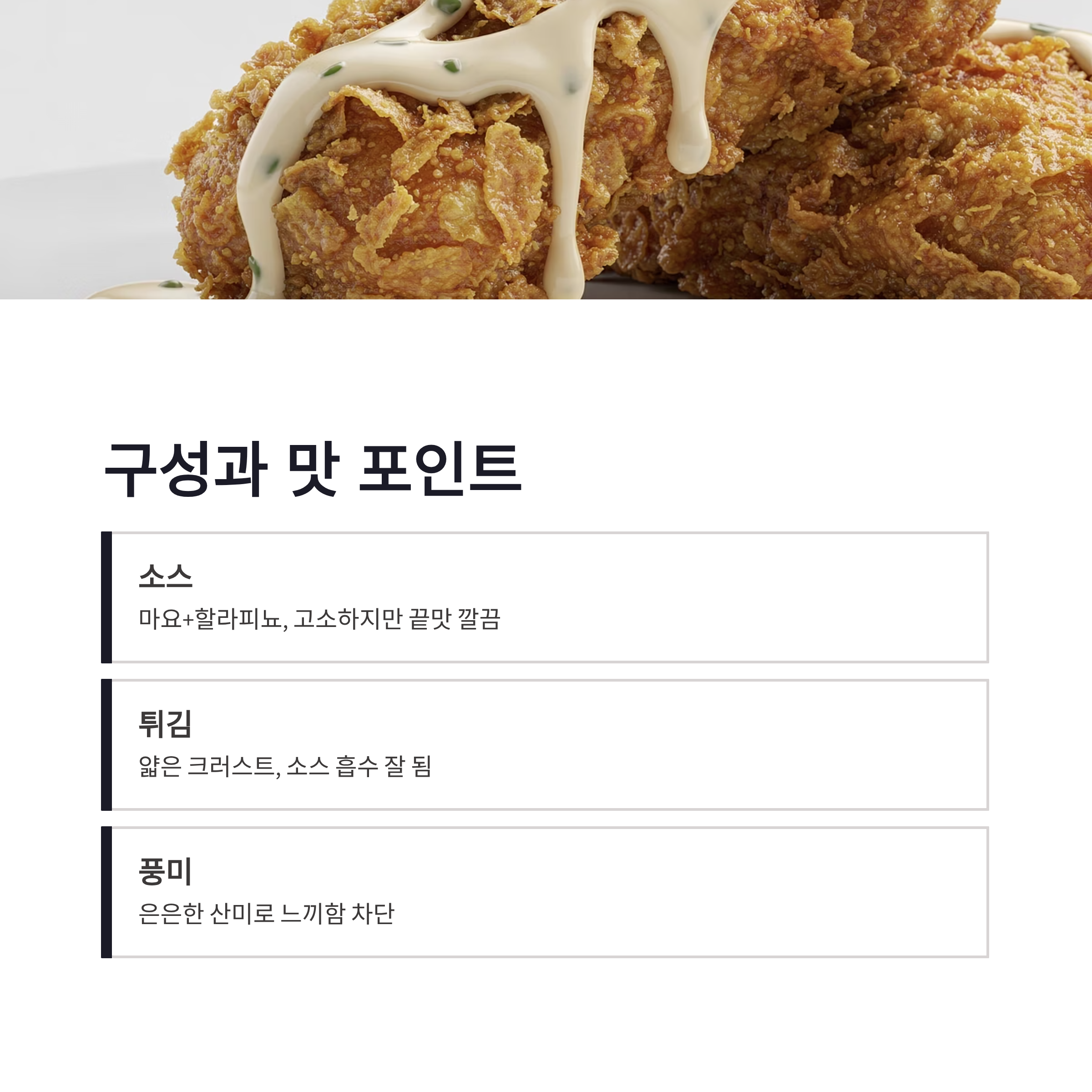 | 구분 | 특징 | 체감 포인트 | | -- | ------- | ----------- | | 소스 | 마요+할라피뇨 | 고소하지만 끝맛 깔끔 | | 튀김 | 얇은 크러스트 | 소스 흡수 잘 됨 | | 풍미 | 은은한 산미 | 느끼함 차단 |