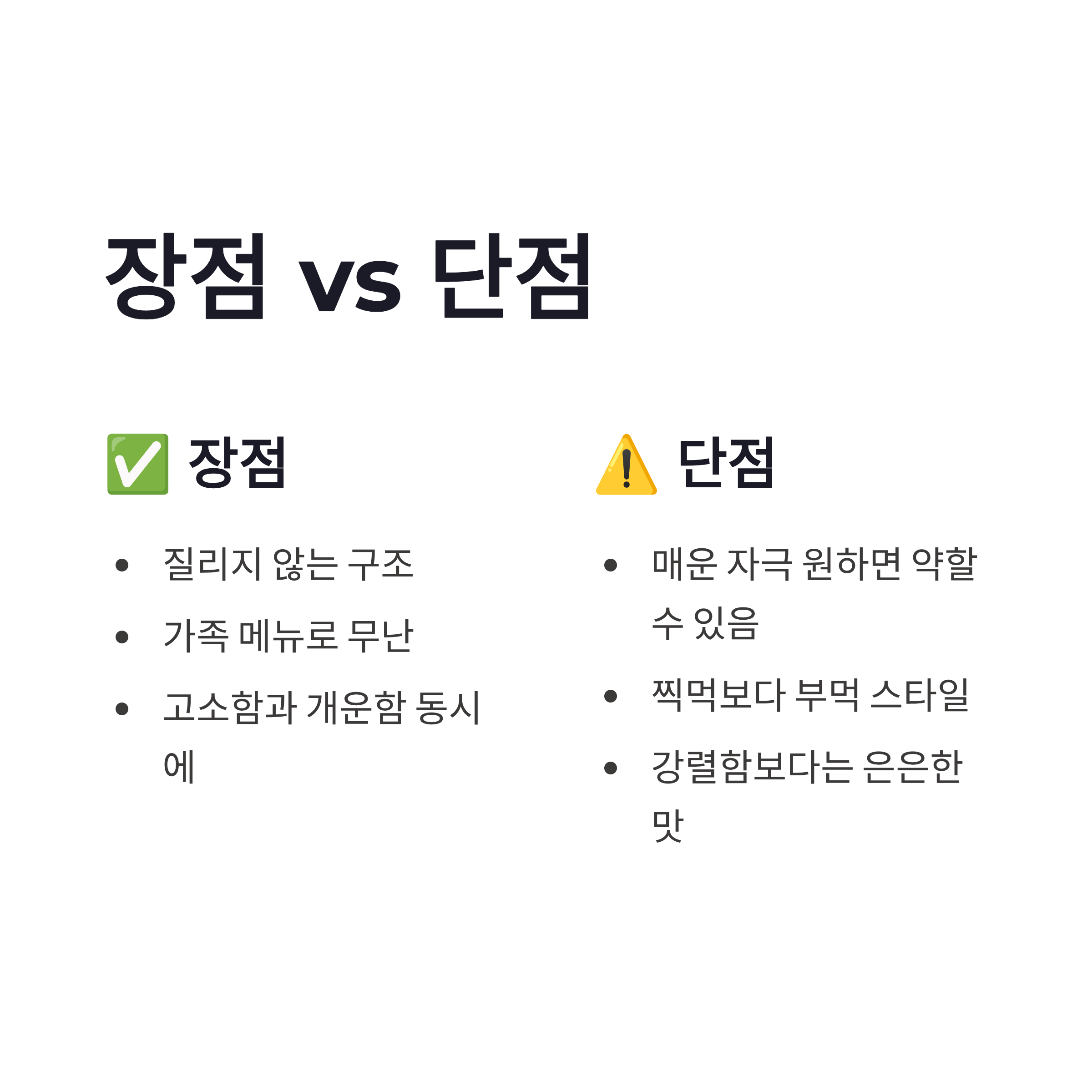 단점도 있어요. 매운 자극을 원하는 분들에겐 약할 수 있습니다. 또 소스 중심이라 찍먹보다 부먹 스타일에 가깝습니다.