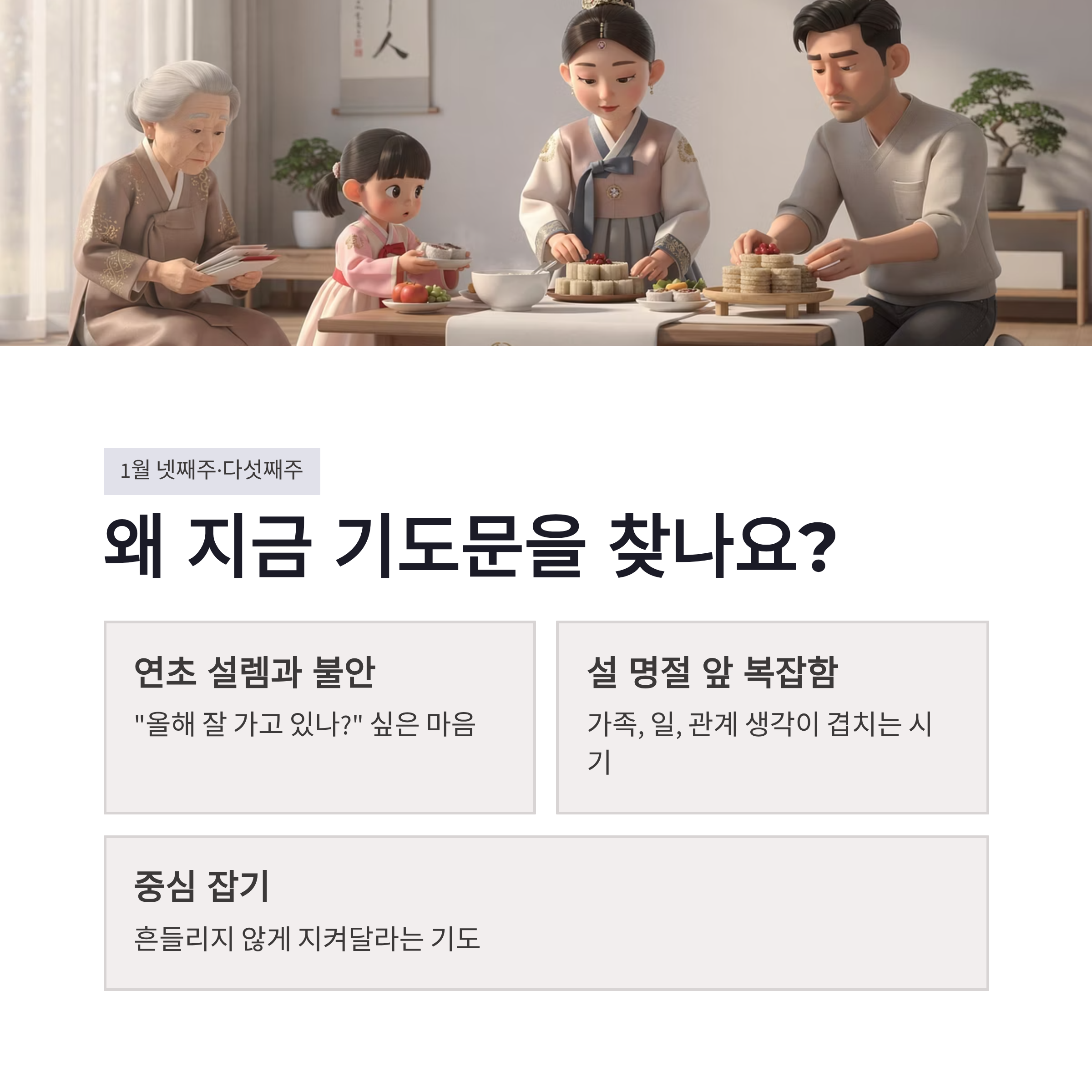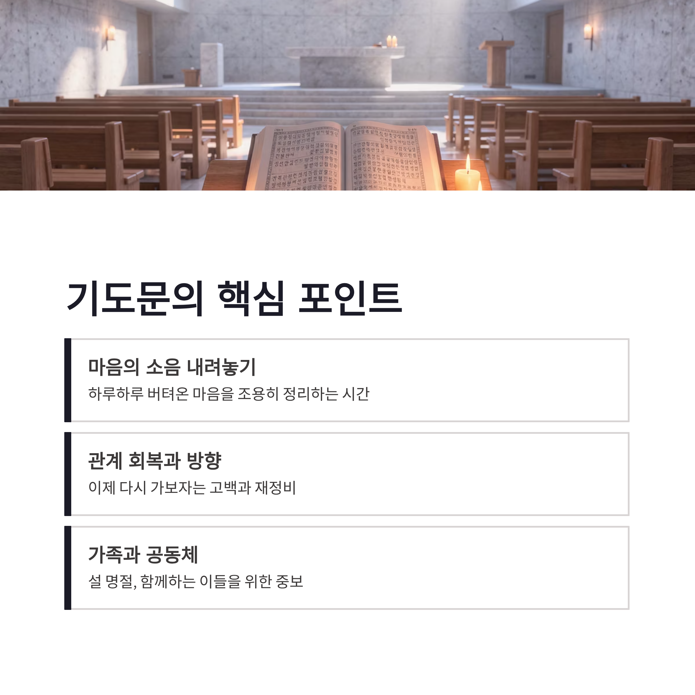 설 명절이 포함된 이 주간은 개인 기도와 공동체 기도가 자연스럽게 겹치는 구간이었어요. 그래서 2026년 1월 대표 기도문도 내용이 조금 달라지더라구요. 제가 정리하면서 느낀 흐름은 아래처럼 나뉘었습니다.