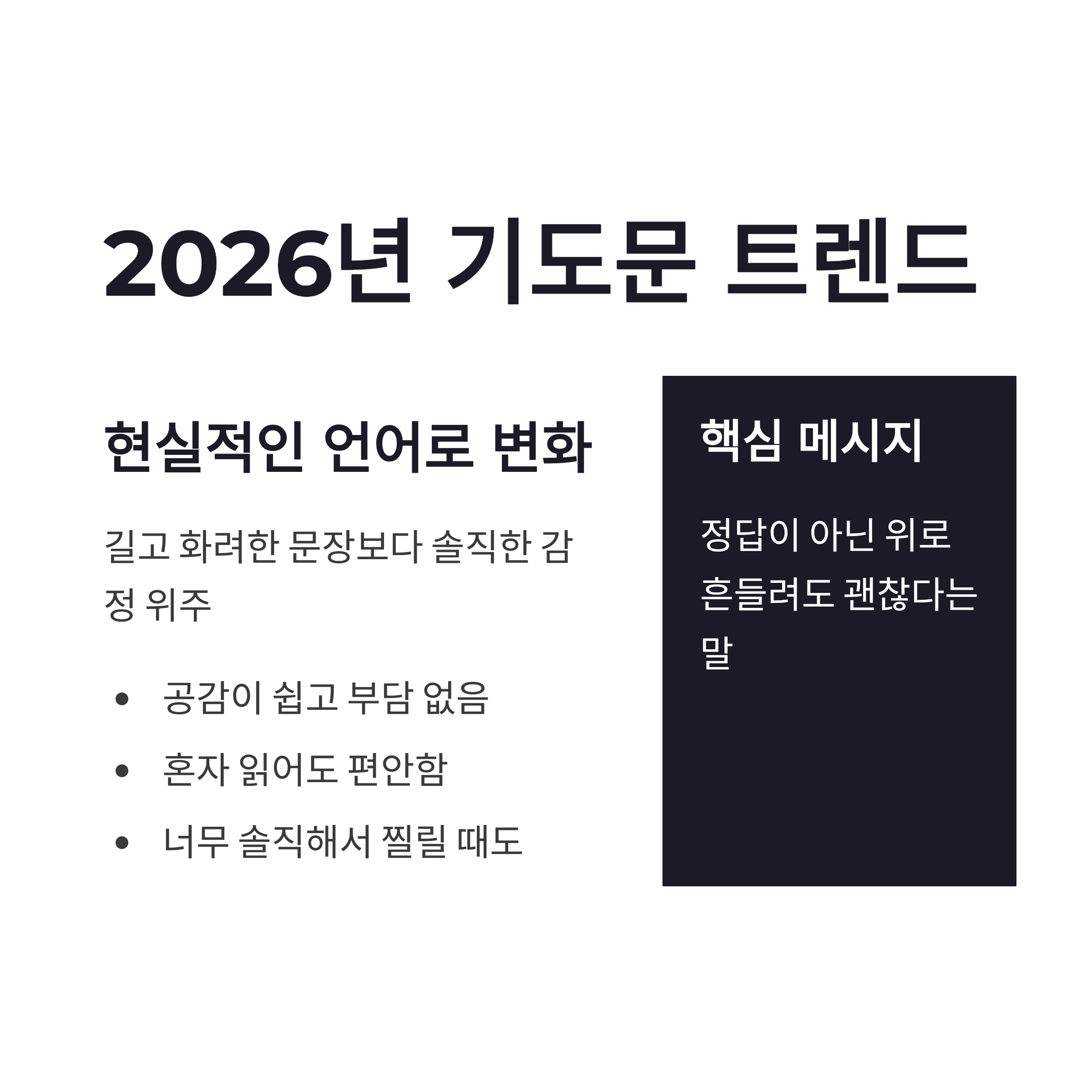 요즘 기도문 트렌드는 길고 화려한 문장보다, 솔직한 감정 위주로 많이 바뀌었어요. 2026년 들어서는 특히 현실적인 언어가 많아졌다는 느낌이 강했구요. 장점이라면 공감이 쉽고, 혼자 읽어도 부담이 없다는 점! 단점은… 너무 솔직해서 찔릴 때가 있다는 거 ㅋㅋ 그래도 2026년 1월 대표 기도문을 통해 느낀 건 하나였어요. 정답을 달라는 게 아니라, 흔들려도 괜찮다고 말해주는 시간이라는 것. 이게 참 컸습니다.