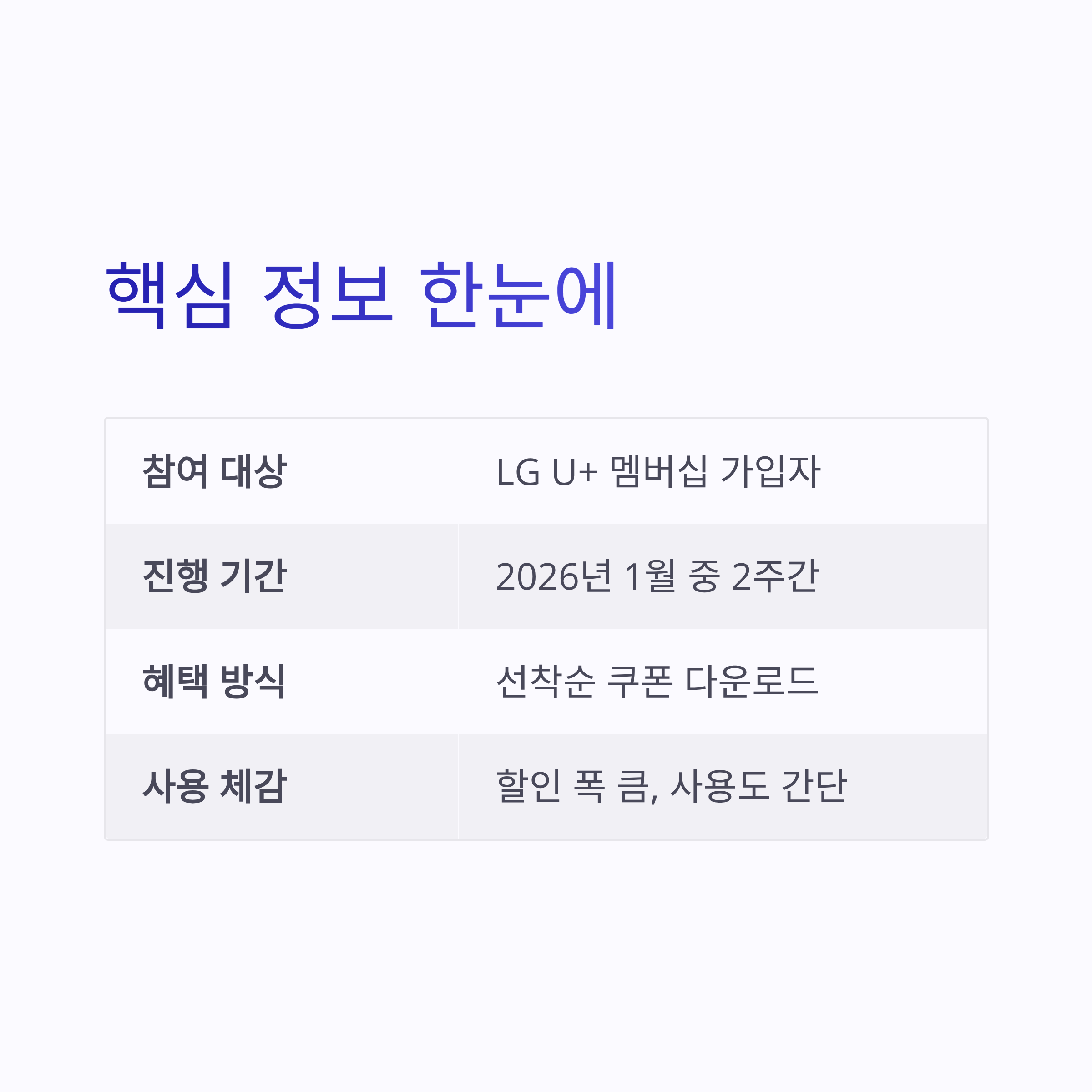 처음 쓰는 분들 헷갈릴 수 있는데, 막상 해보면 어렵진 않았어요. LG U+ 멤버십 앱 들어가서 유플투쁠 탭만 누르면 끝이었구요. 선착순이라 살짝 긴장하면서 눌렀는데 다행히 성공했네요 ㅎㅎ 아래 표로 2026년 1월 유플투쁠 핵심 포인트만 정리해봤어요.